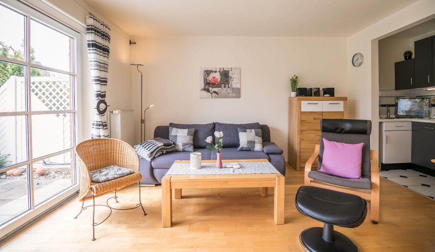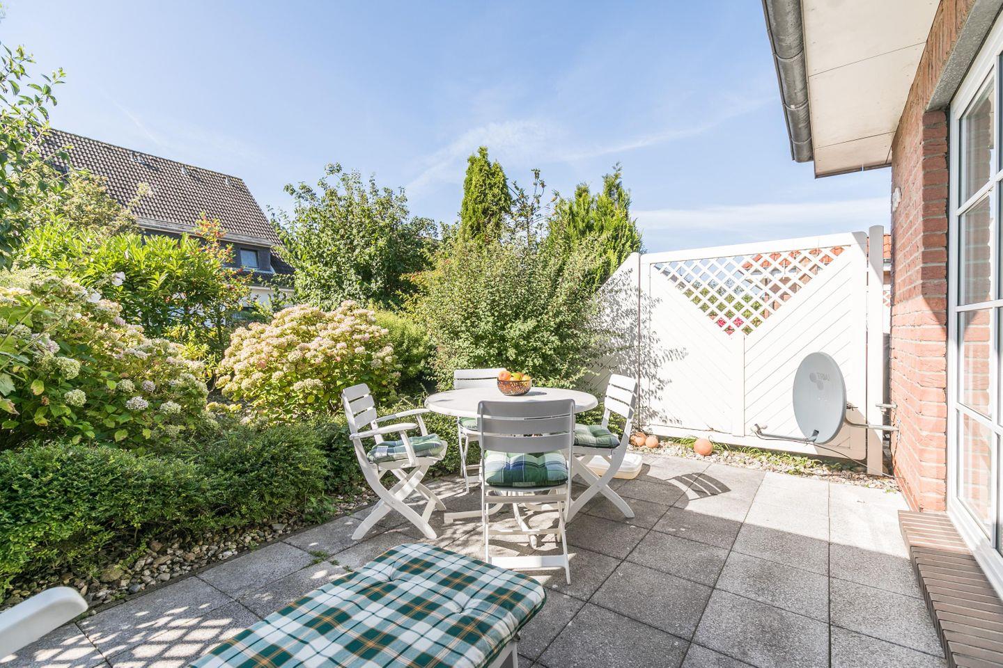 Der geräumige Wohn-Essbereich verfügt über gemütliche Sitzplätze, die zum Verweilen einladen. Die Südterrasse Terrasse lädt dazu ein, die frische Nordseeluft zu genießen und Sonne zu tanken.
