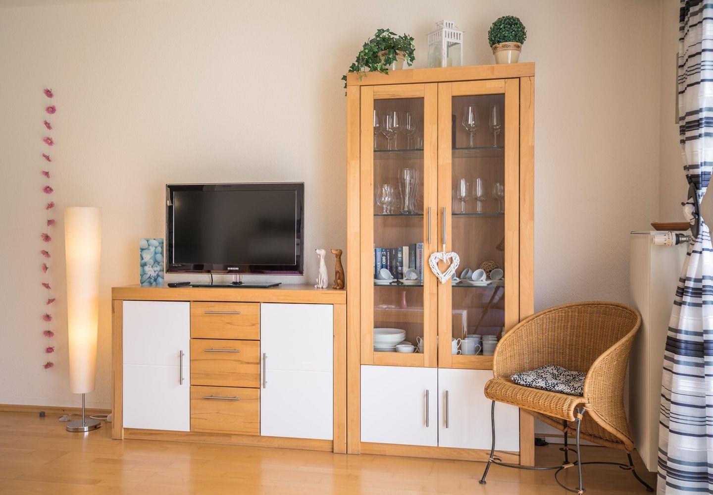 Sofa, Fernsehsessel, 2 Korbsessel, Esstisch mit Stühlen, Flachbild-TV, Stereoanlage mit CD-Player und USB-Host, Bücher, Spiele, Parkettboden