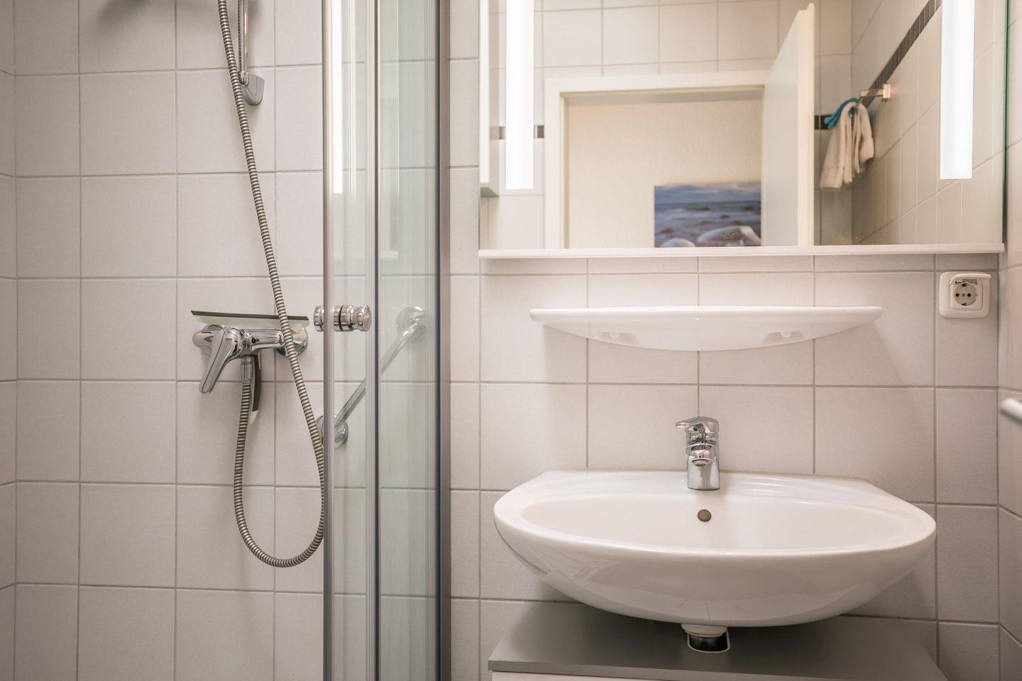 Duschbad mit Glasabtrennung, WC, Waschtisch mit großem Spiegel, Hängeschrank, Fön, Oberlicht elektr. zu öffnen