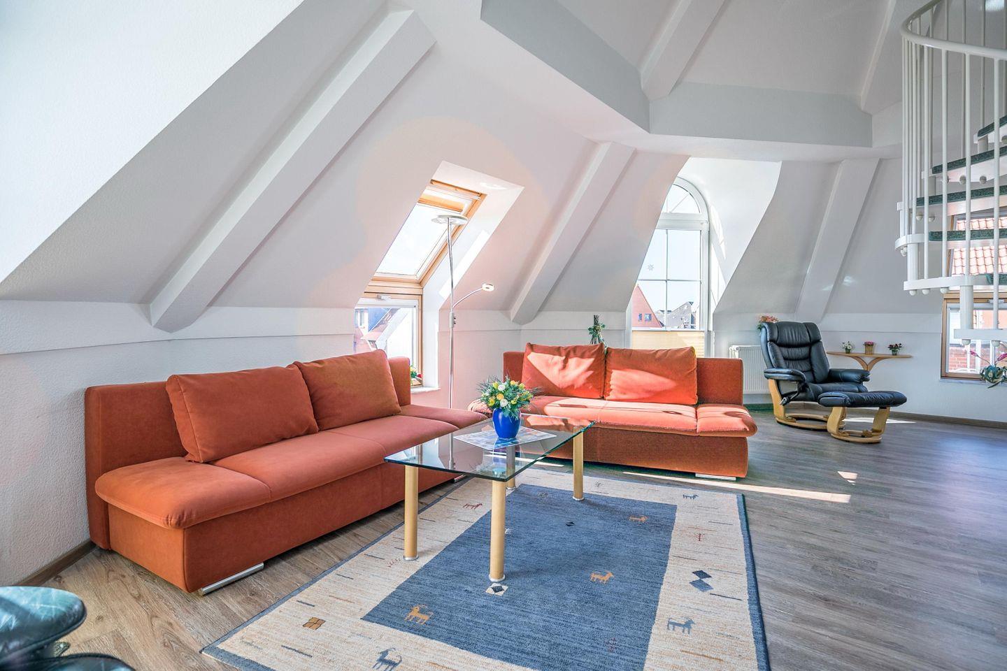Die praktische Ferienwohnung in Büsum bietet auf ca. 68?m² Platz für bis zu 4 Personen. Das Wohnzimmer im charmanten „Türmchen“ ist offen gestaltet und führt zur Galerie mit Doppelbett. Zwei Schlafsofas im Wohnbereich bieten zusätzliche Schlafmöglichkeiten. Die offene Küche ist voll ausgestattet mit Geschirrspüler, Backofen und Mikrowelle.