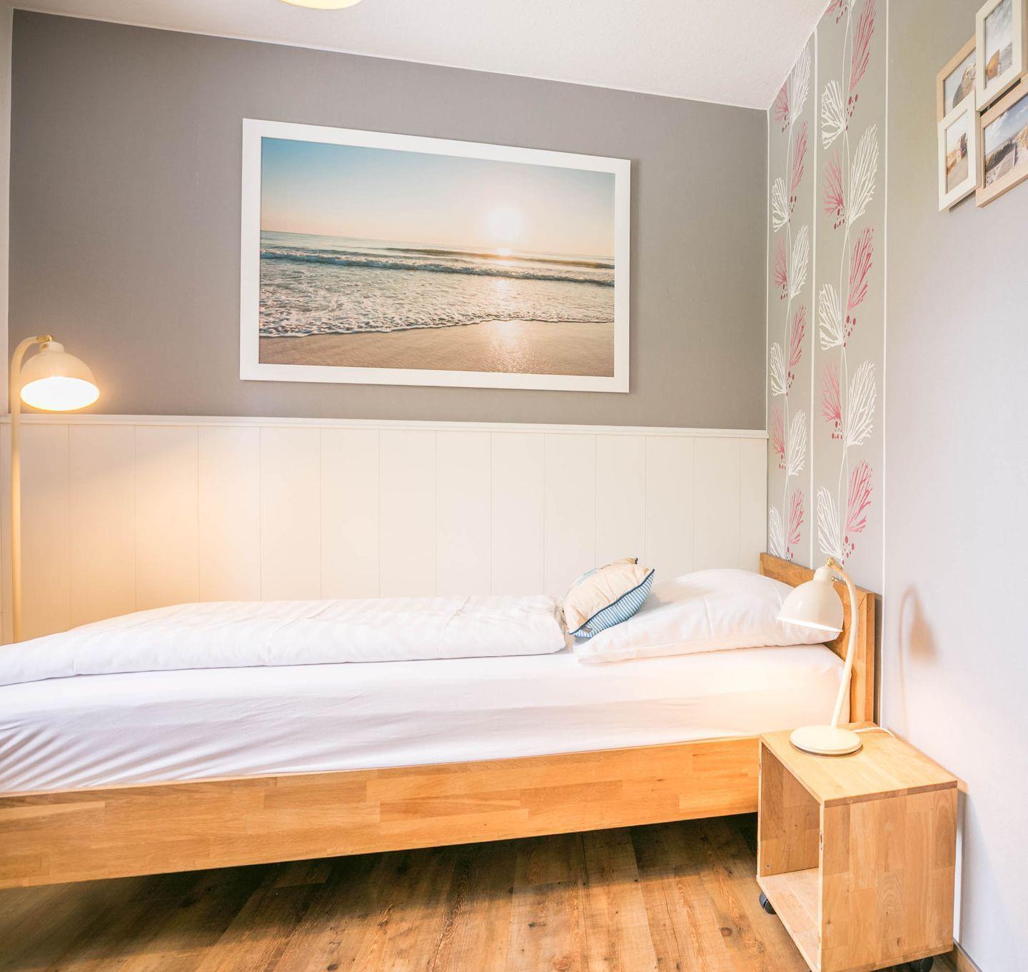 Einzelbett (2,00 x 0,90 m), kleiner Kleiderschrank, Flachbild-TV, Nachttisch mit Nachtleuchte