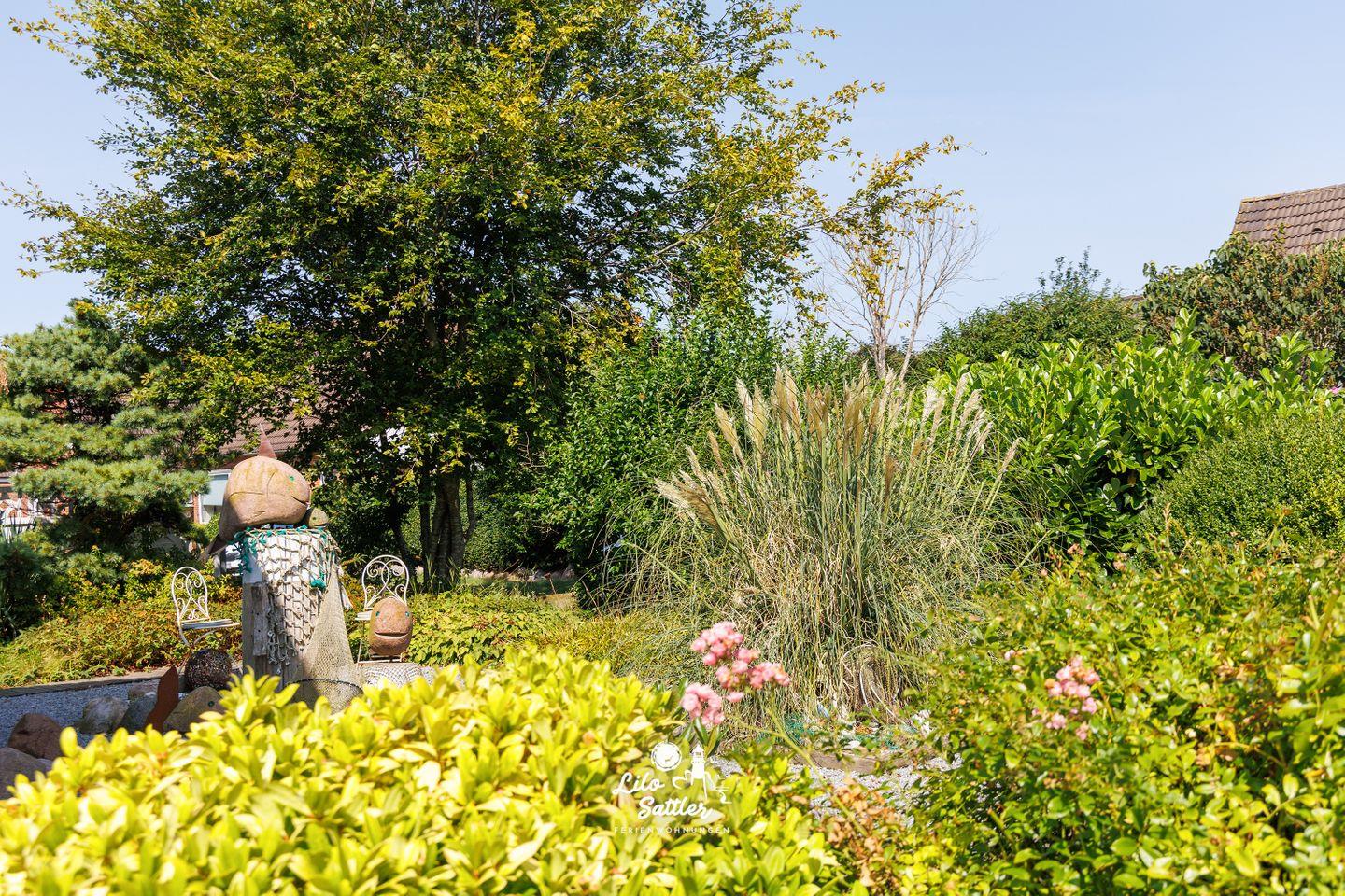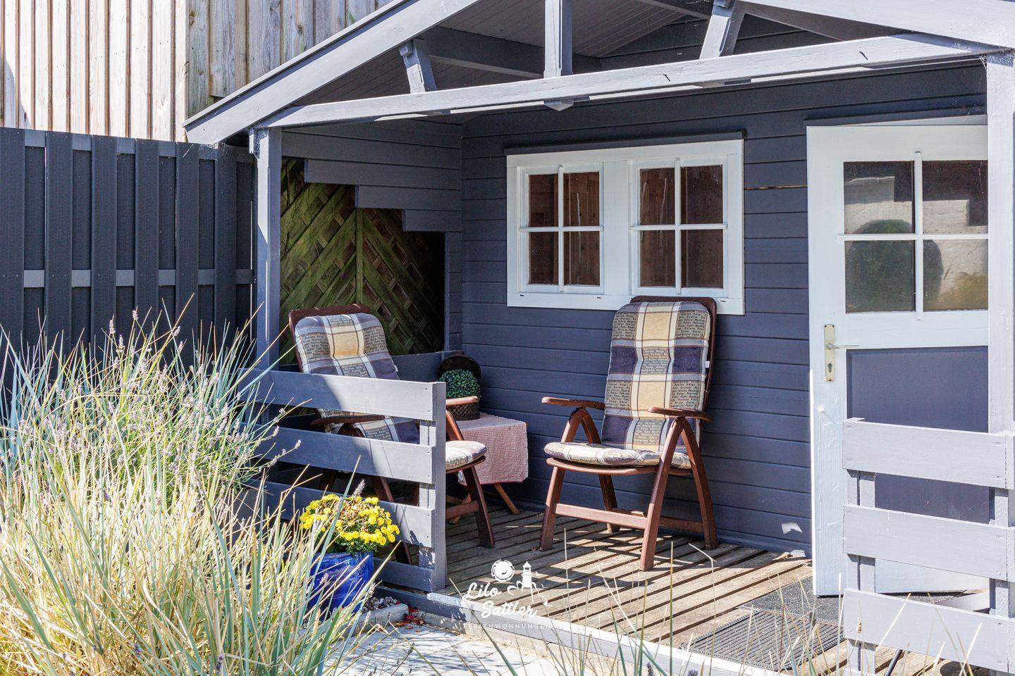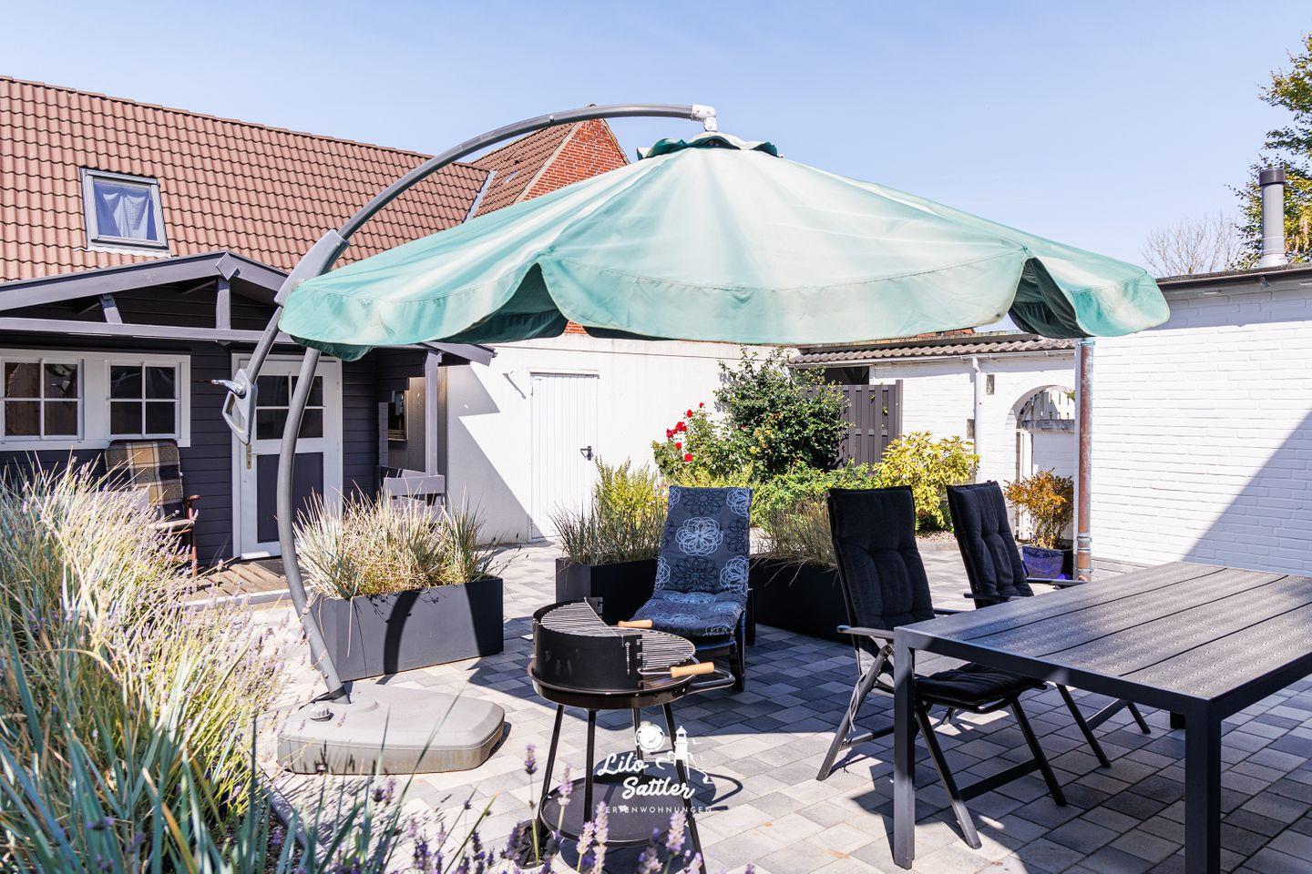 Ein besonderes Highlight: die private Sauna im Gartenhaus – perfekt nach einem langen Spaziergang an der Küste. Der geschützte Innenhof mit Terrasse lädt zum Verweilen ein.