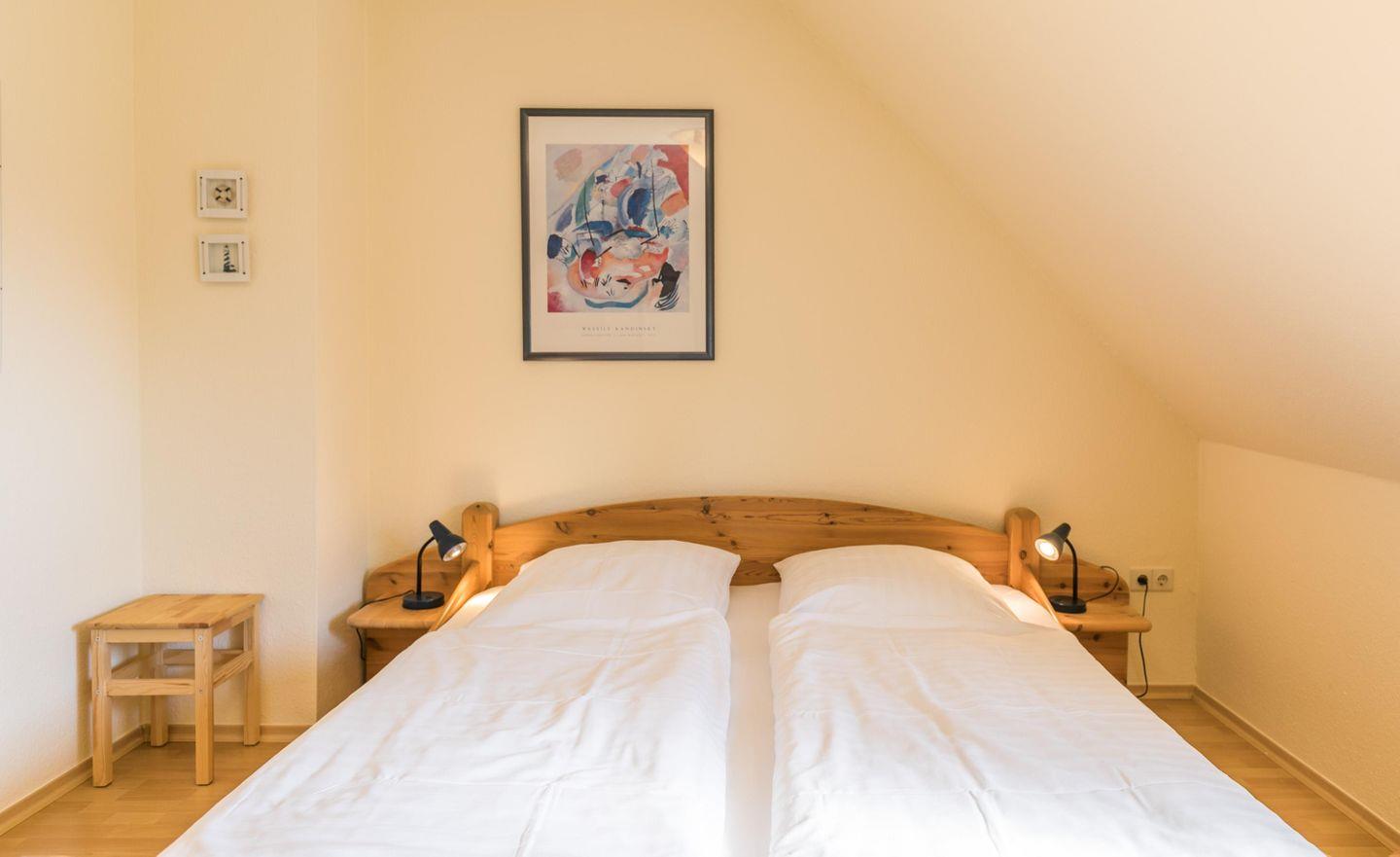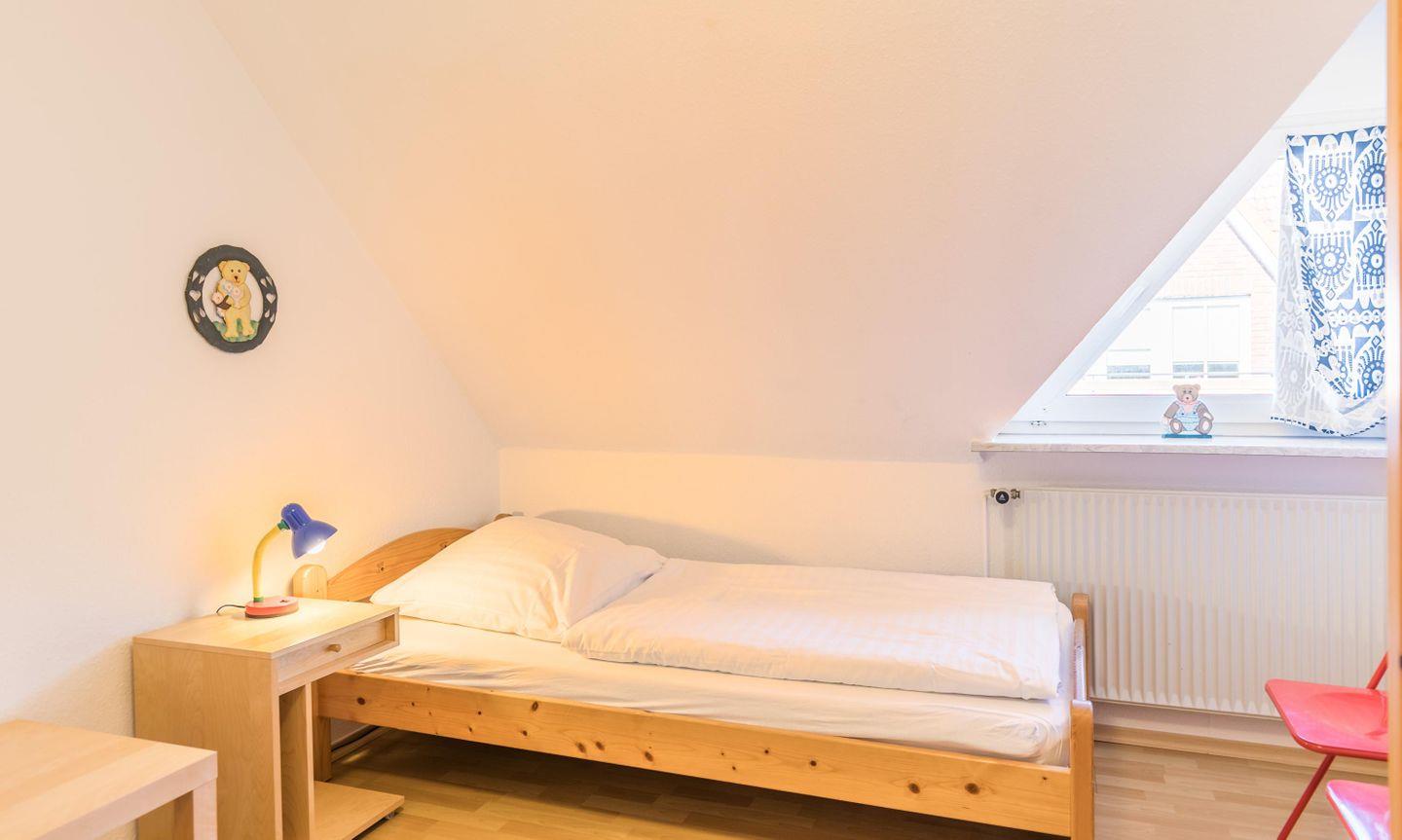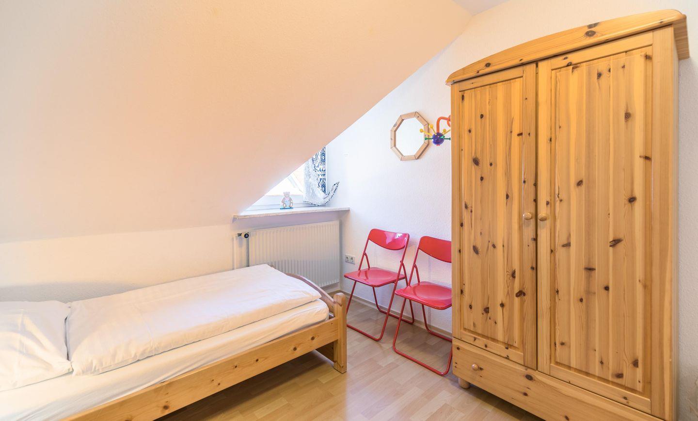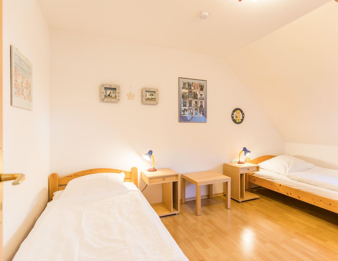 2 Einzelbetten (2 Matratzen á 200 cm x 90 cm, mittlere Stärke, neu in 01/24), 2 Nachttische, Tisch, 2 Stühle, Schrank