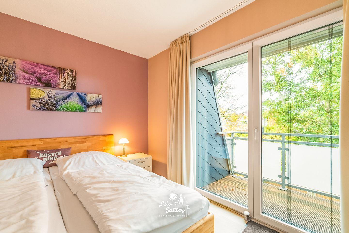 Doppelbett (180cm x 200cm) mit getrennten Matratzen, verstellbarer Lattenrost Kopf - und Fußteil, Kleiderschrank 3-türig, Hocker, Verdunklungsvorhänge, Zugang zu kleinem Balkon