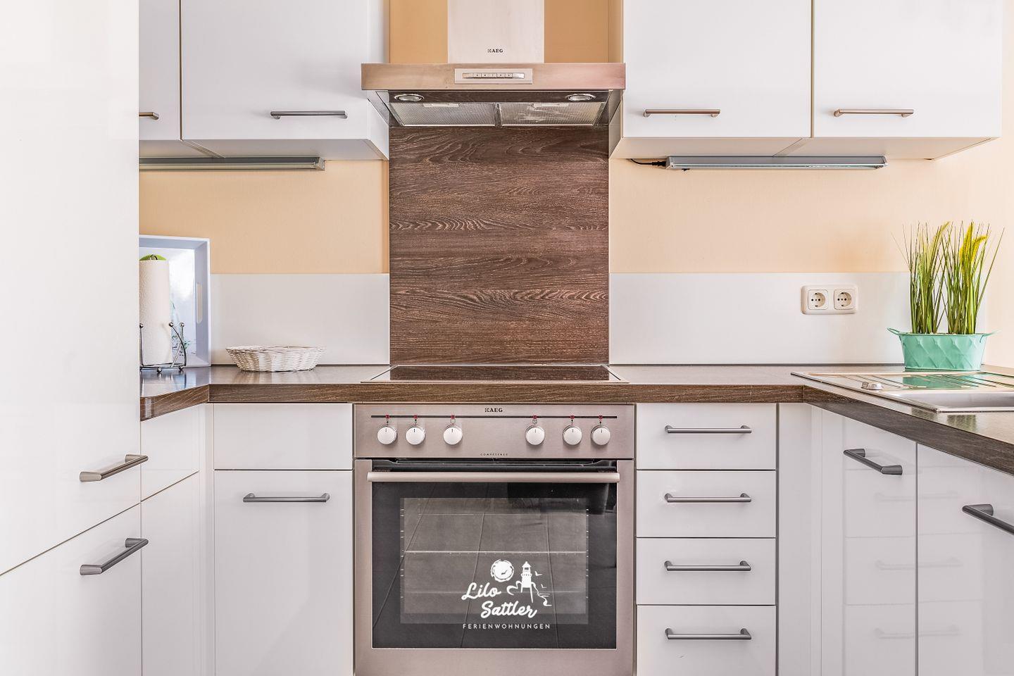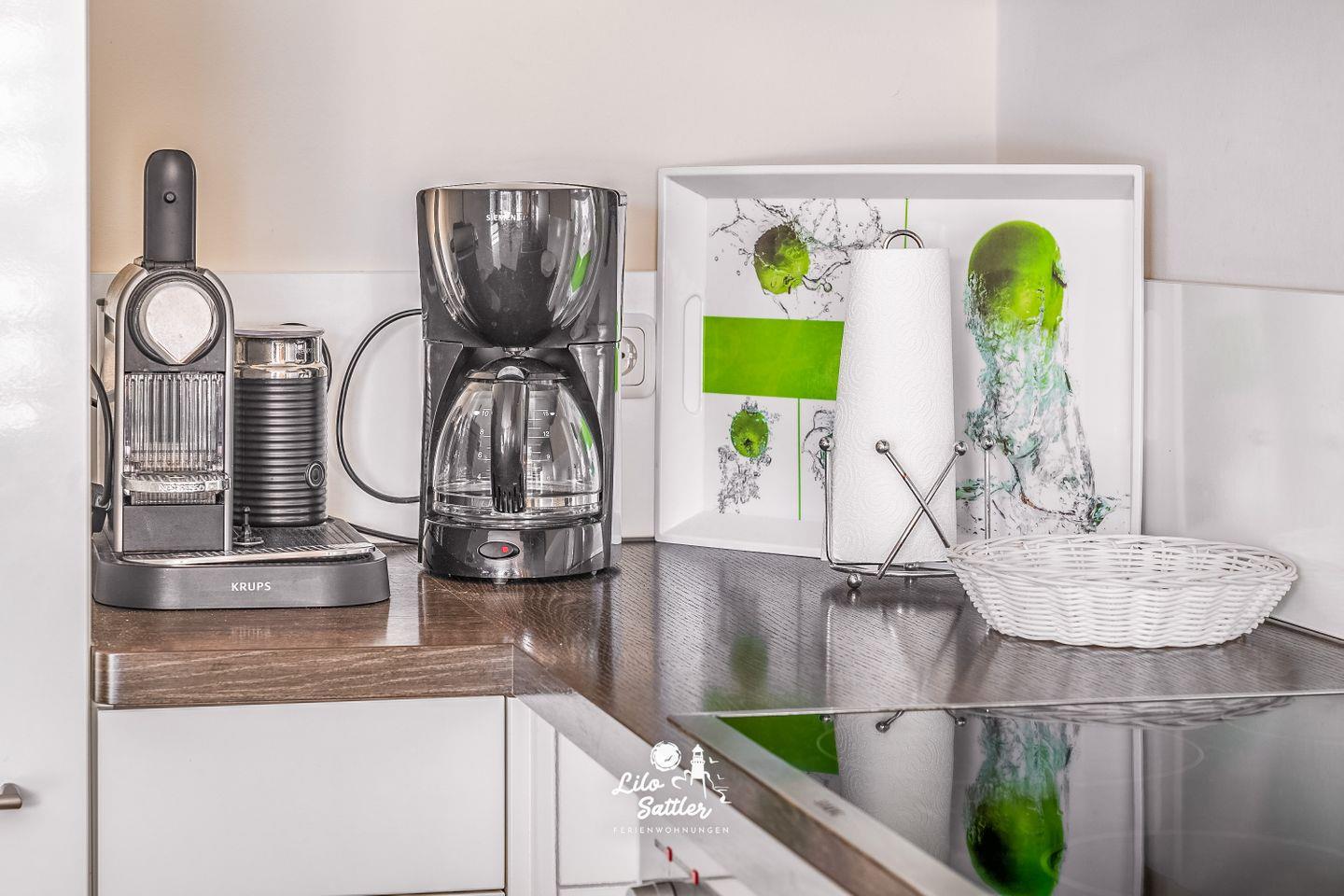 offene Küche, Cerankochfeld, Backofen, Geschirrspüler, Kühlschrank mit Gefrierfach, Toaster, Wasserkocher, Eierkocher, Kaffeemaschine, Mikrowelle, Krups-Nespresso Kapselkaffeemaschine