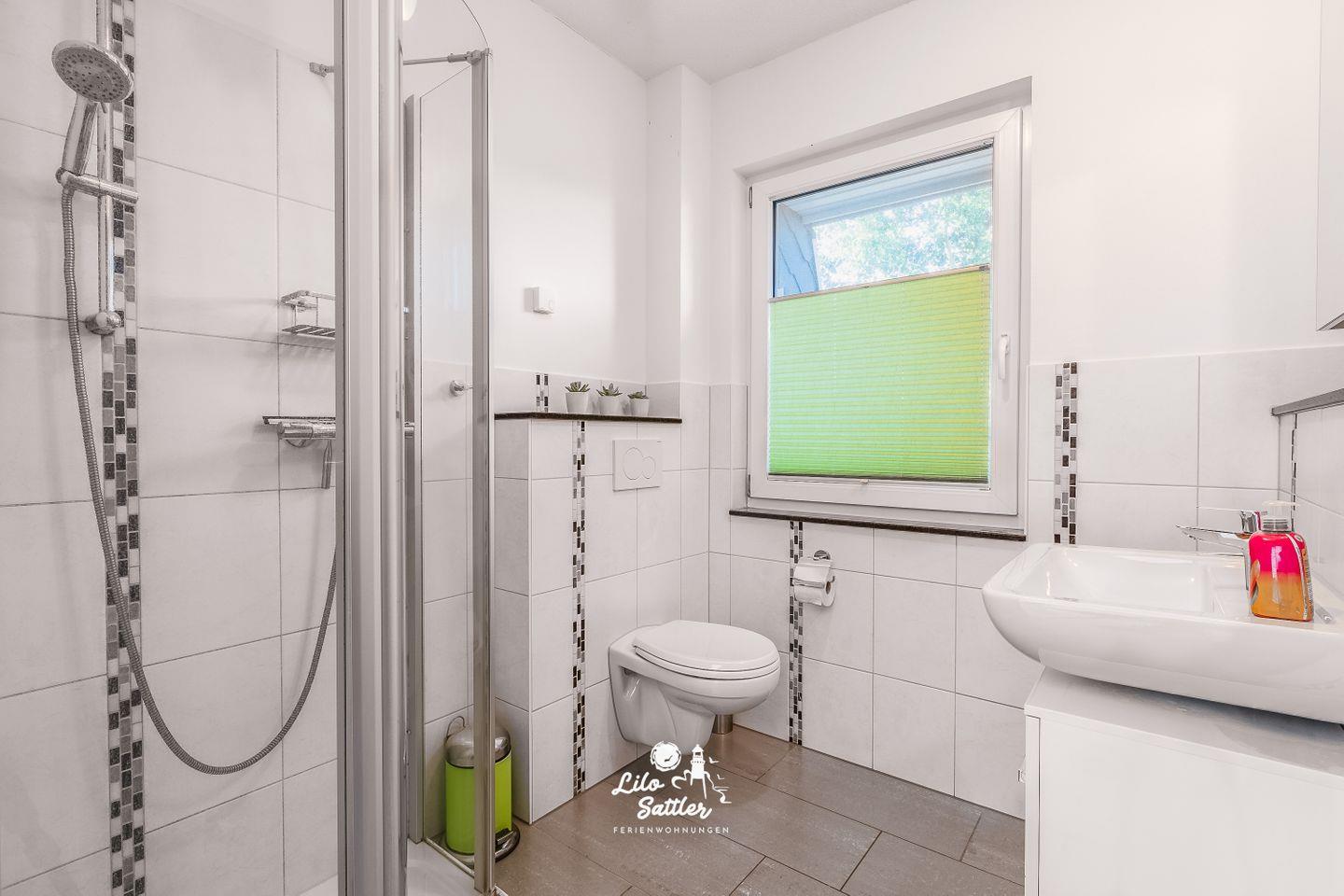 Dusche, WC, Waschbecken mit Unterschrank, Handtuchtrockner, Spiegel, Ablagen, Föhn, Fenster mit Plissee