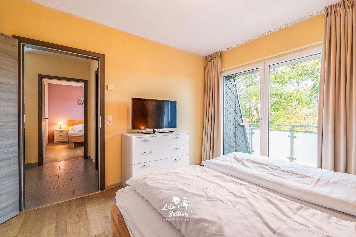 Insgesamt gibt es zwei Schlafzimmer mit Doppelbett, ein Schlafzimmer davon mit TV. Zu jedem Schlafzimmer gehört ein eigener kleiner Balkon.