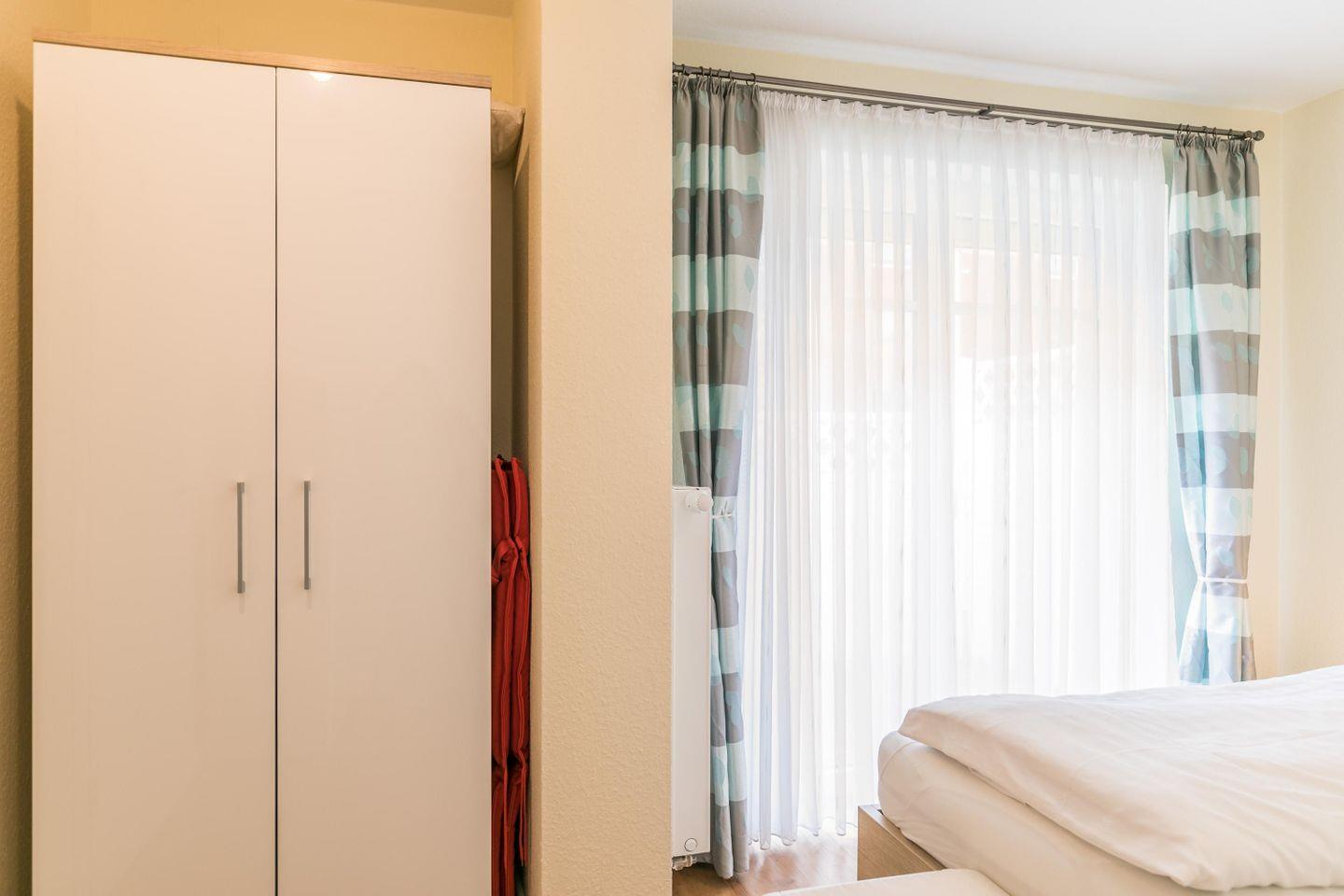 Doppelbett (je 90 x 200), verstellbare Lattenroste, 2 Nachtschränke, Kleiderschrank, Flachbild-TV, Terrasse, Außenjalousie