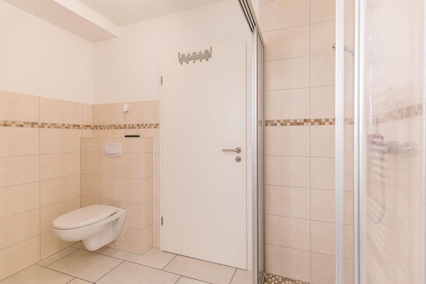 Bodentiefe Dusche, WC, Handtuchwärmer, Ablage, Oberlüftung