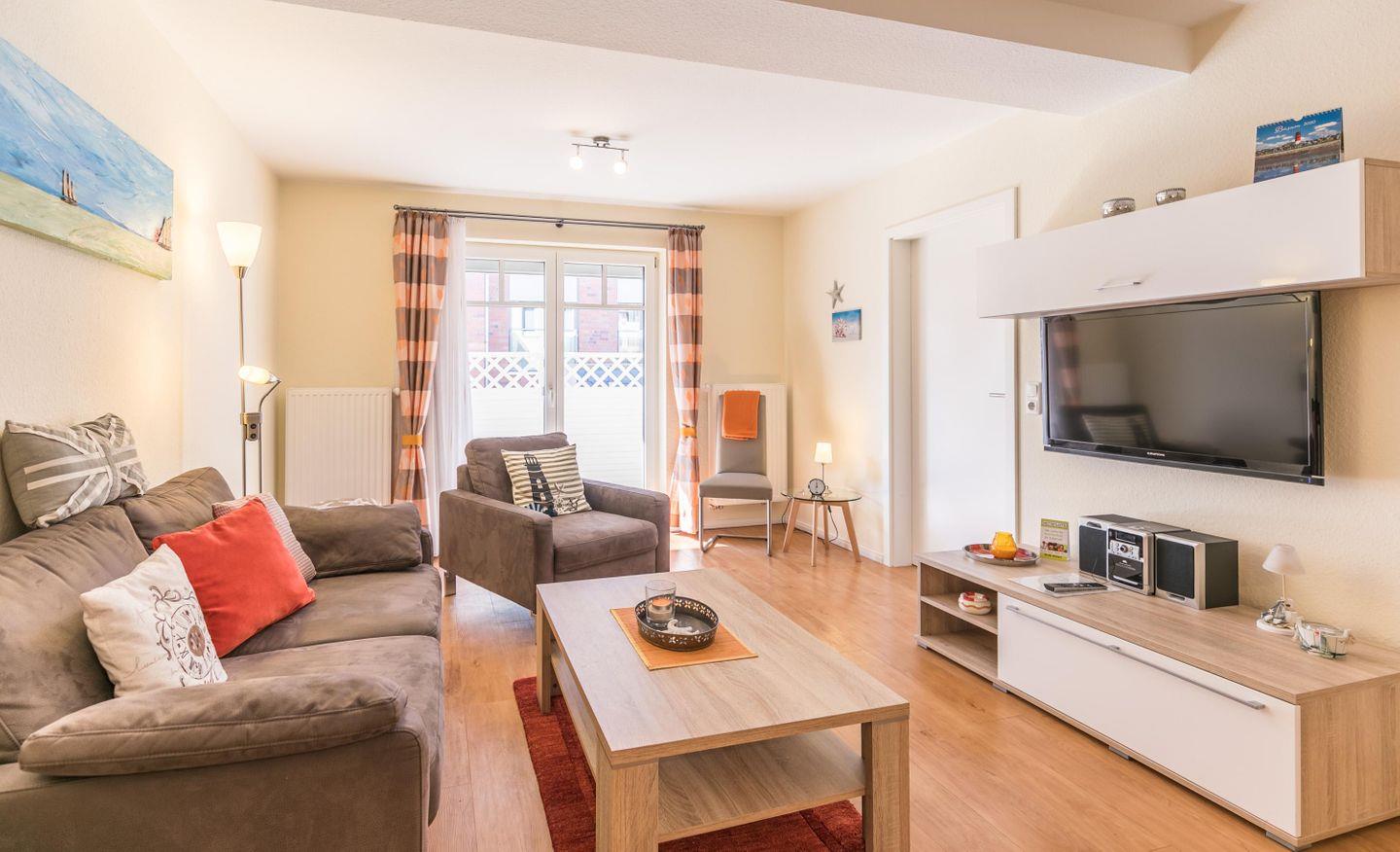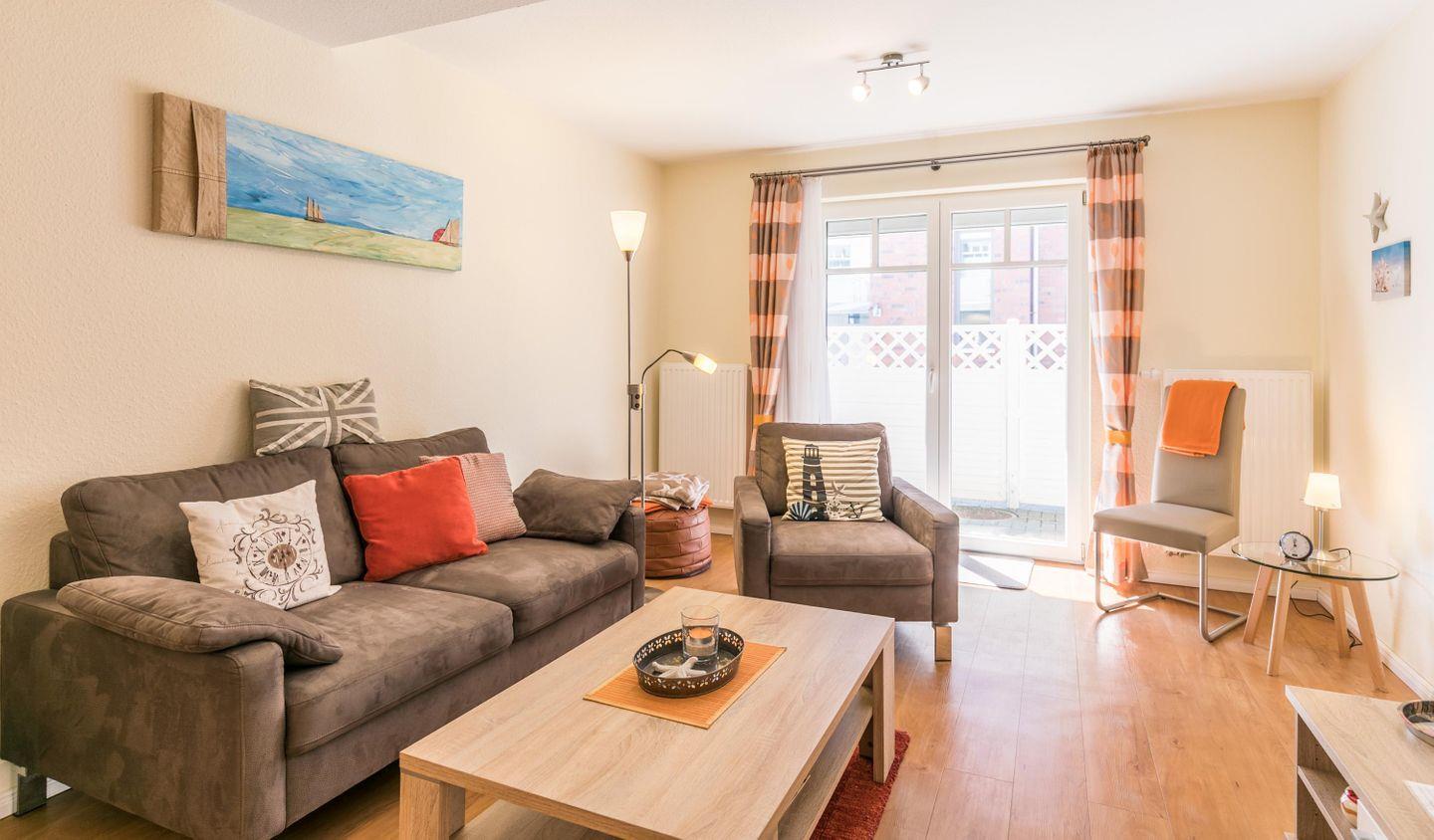 Der Wohnbereich ist hell und freundlich gestaltet, ideal für entspannte Stunden zu zweit.