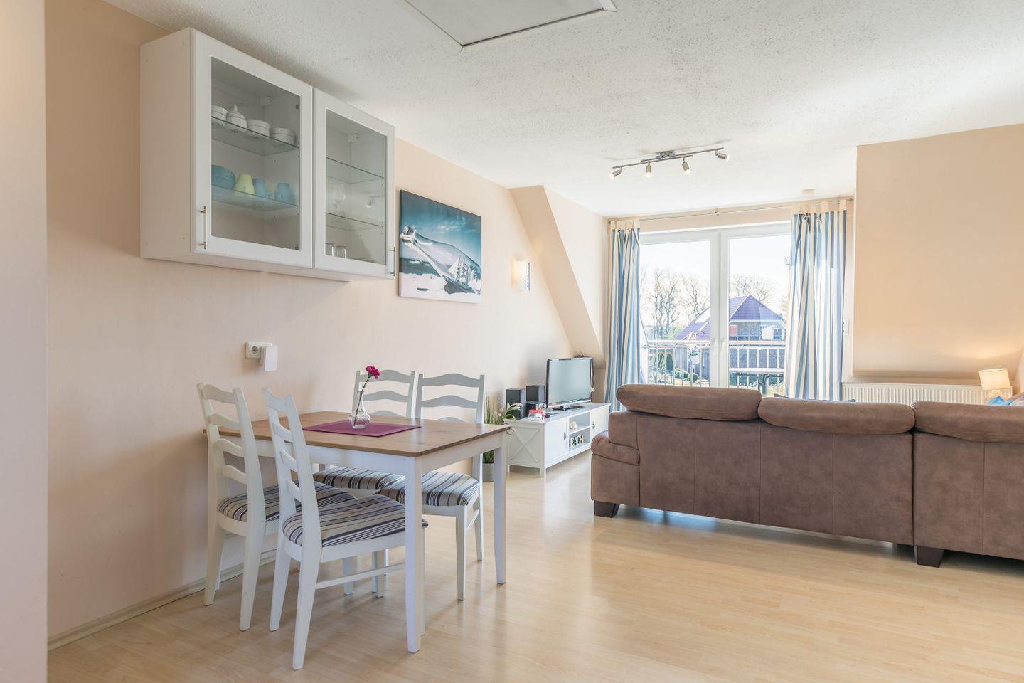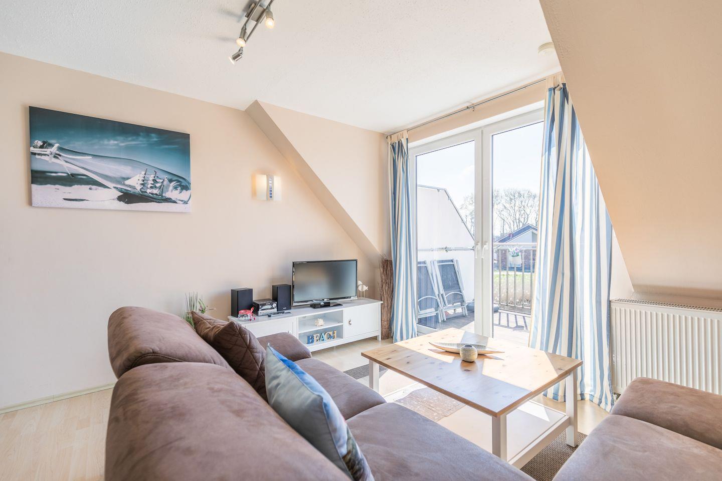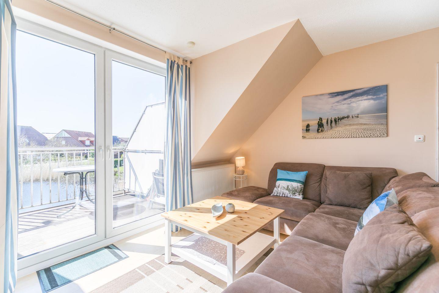 Schlafsofa, Flachbild-TV, CD-Player mit Radio, Esstisch mit Stühlen, direkter Zugang zum Sonnenbalkon, Laminatboden
