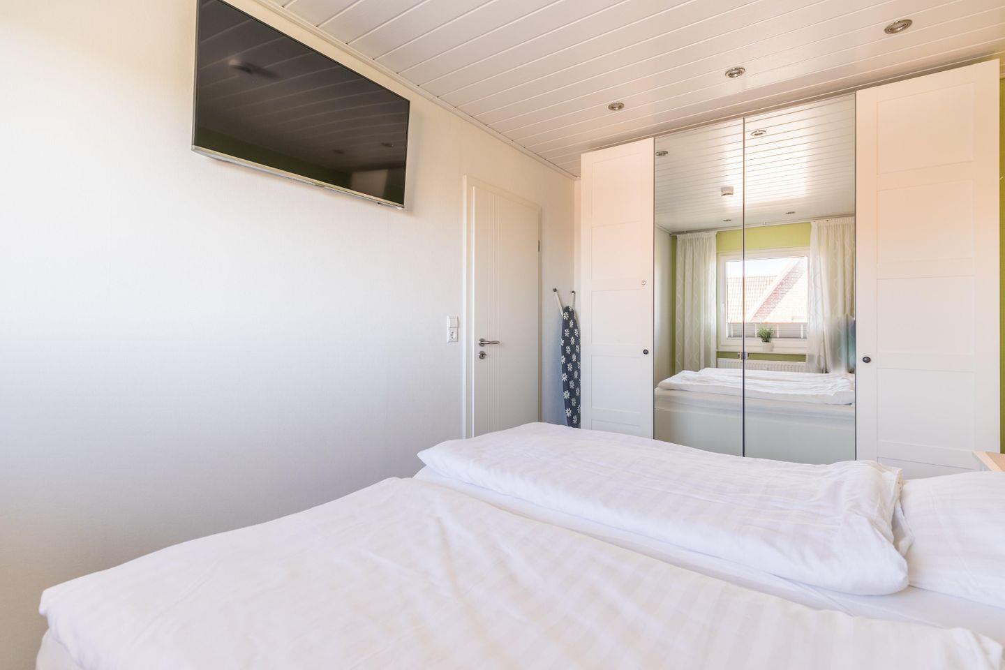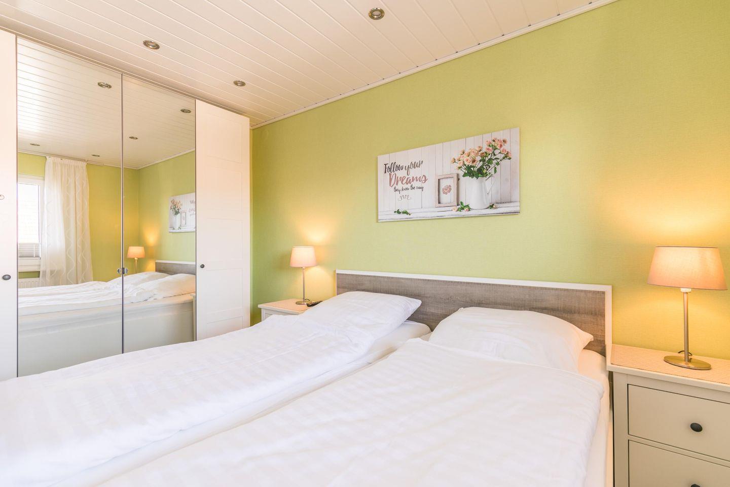 Doppelbett (je Matratze 2,00m x 0,90m), Nachtschränke und Nachtleuchten, Flachbildfernseher, Kleiderschrank 4-türig mit Ganzkörperspiegel