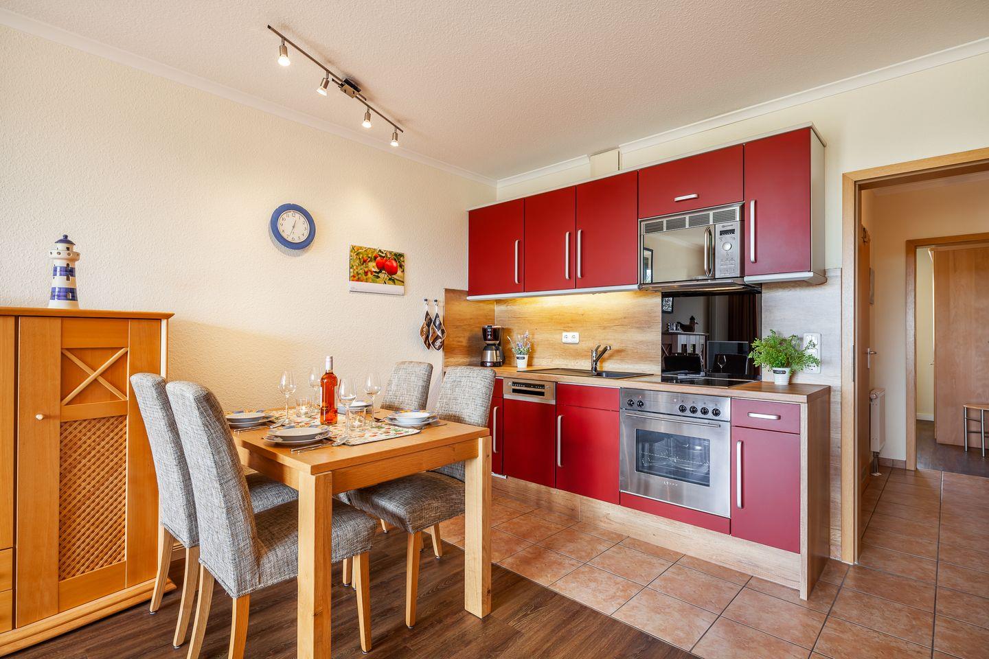 Küchenzeile im Wohnbereich, Geschirrspüler, Kühlschrank mit Gefrierfach, Cerankochfeld und Backofen, Mikrowelle mit Abluft, Kaffee-Kapselmaschine Nespresso, Wasserkocher, Allesschneider, Eierkocher, Toaster, Mixer und Mixstab usw.