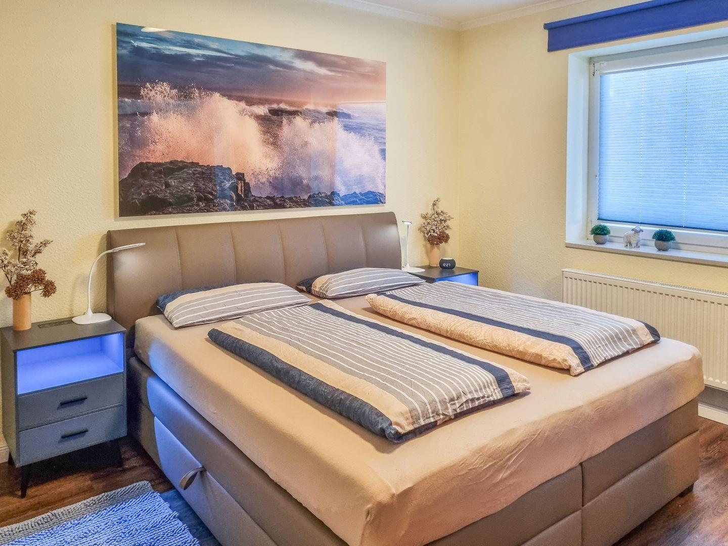 Boxspringdoppelbett (200 x 180), verschiedene Kopfkissen, Kleiderschrank mit Spiegel, Radiowecker und Verdunklungsrollo, Fliegengitter