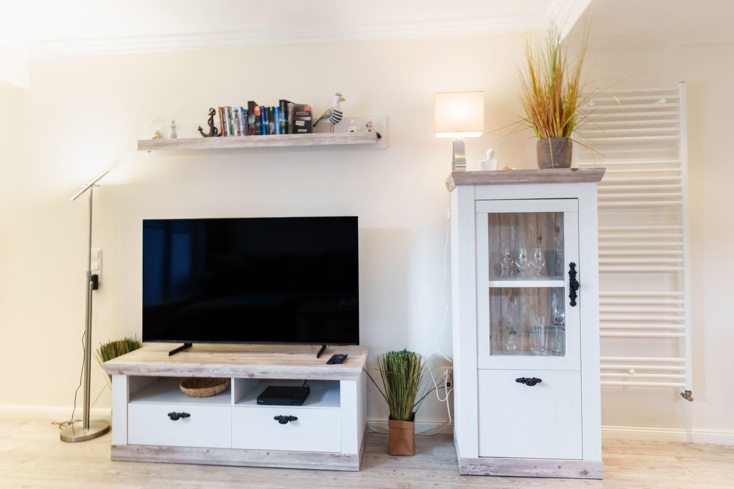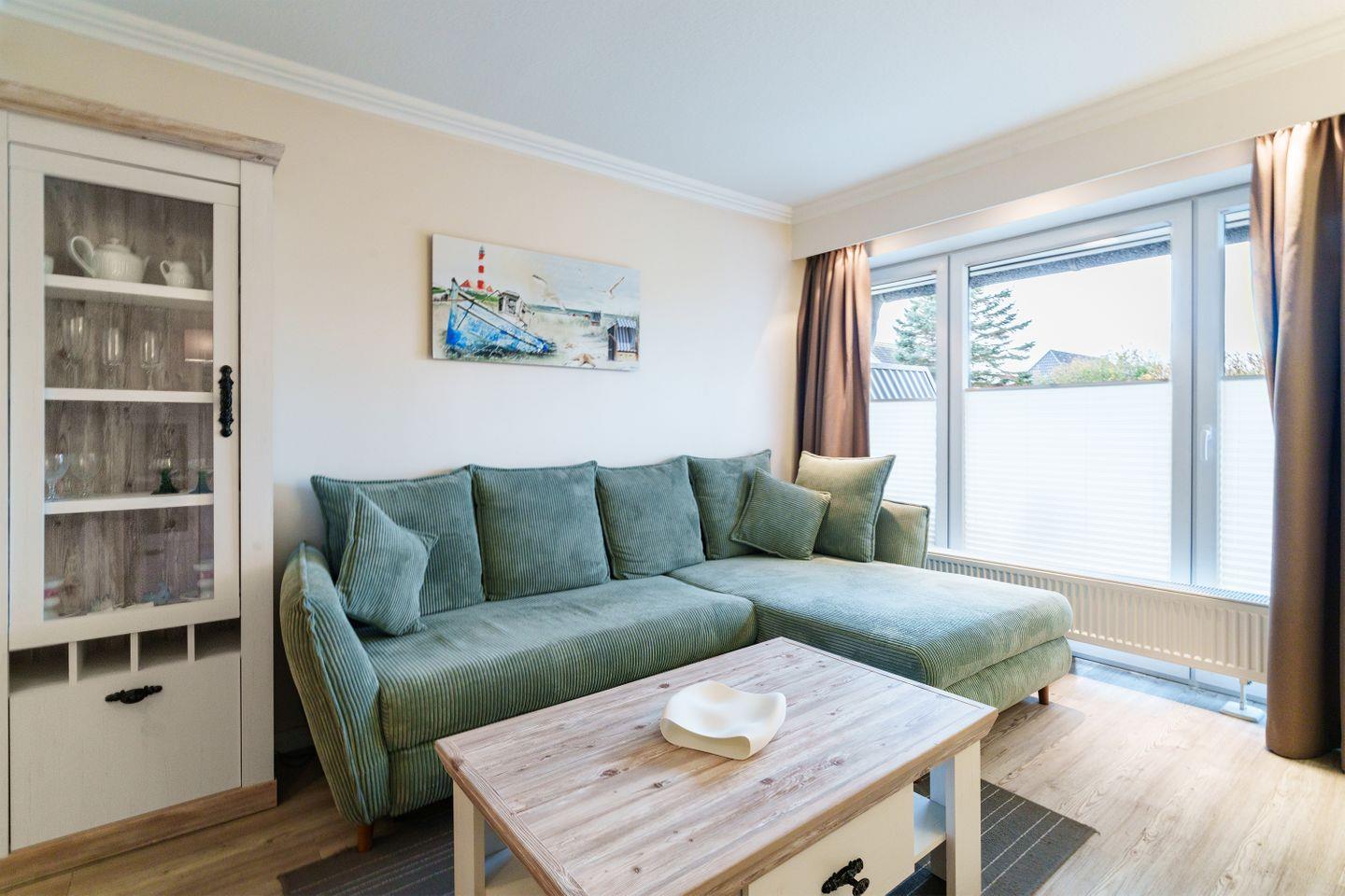 L-Schlafsofa, neuer TV 55Zoll, Blu-Ray-Player, Esstisch mit 4 Stühlen, Plissee und Verdunkelungsvorhang, Zugang zur Westterrasse