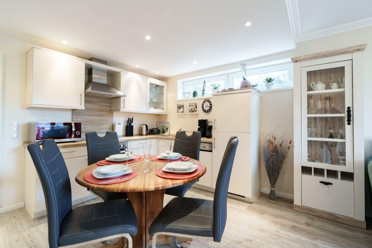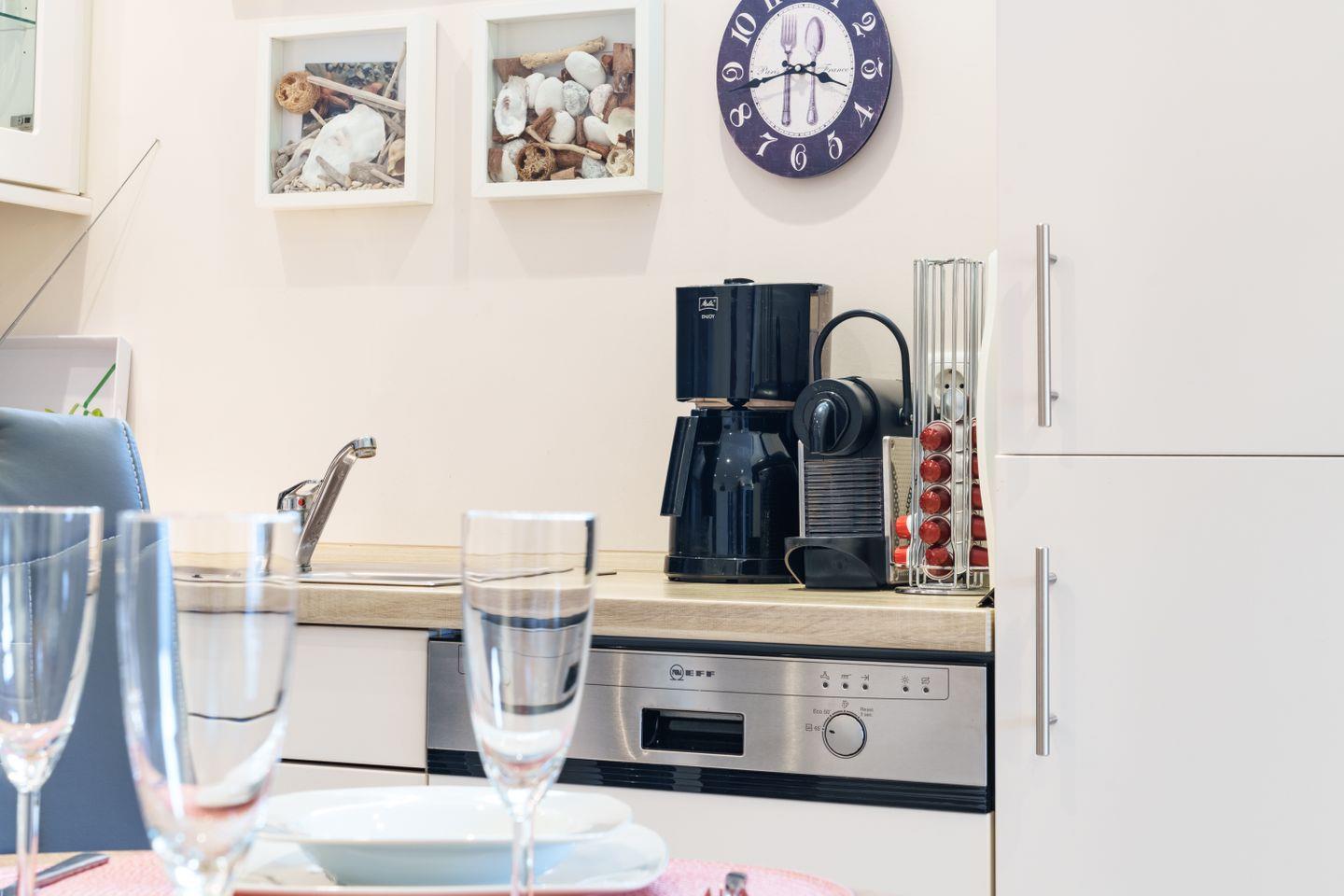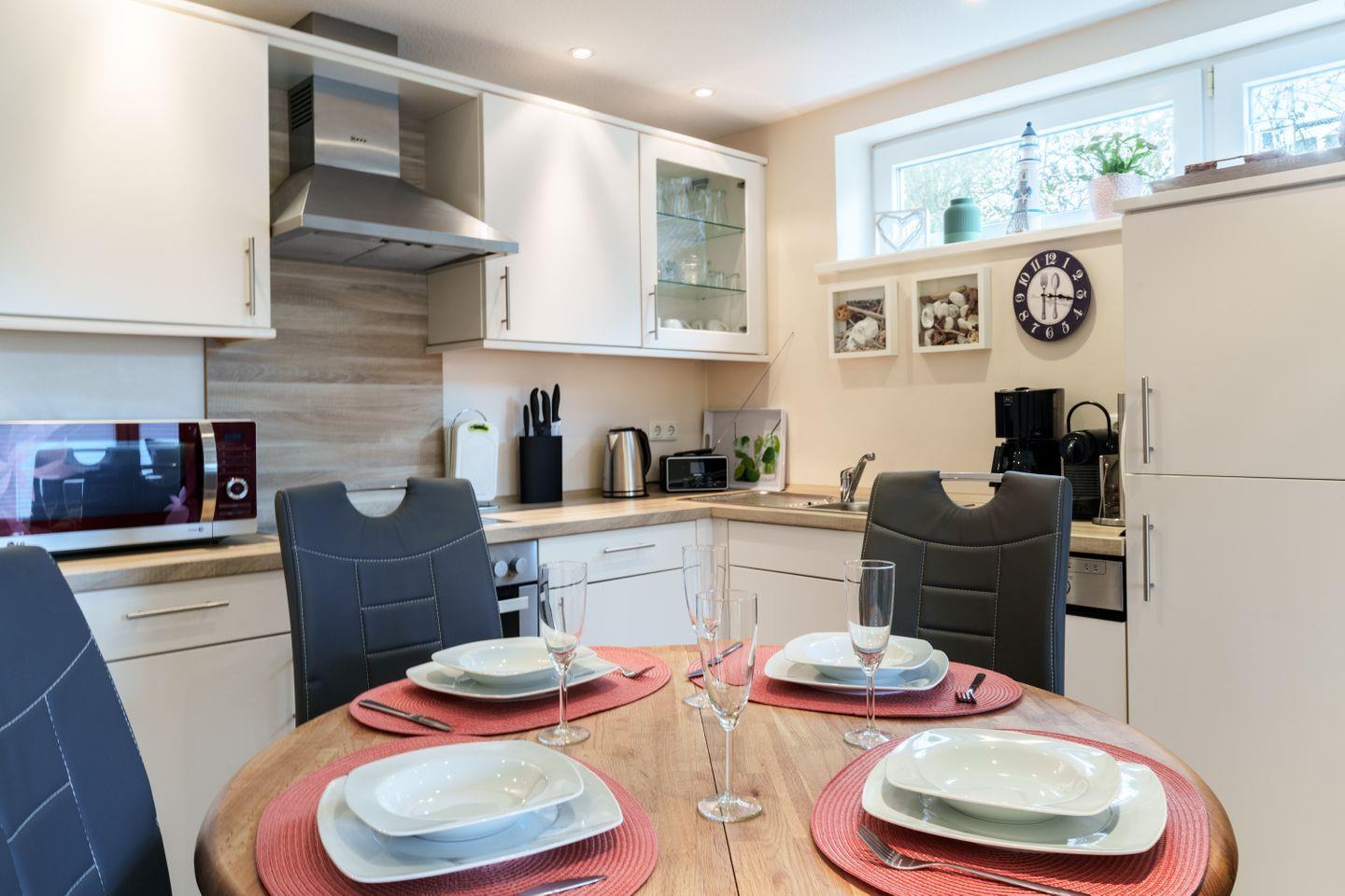 Ceran-Kochfeld, Backofen, Geschirrspüler, Kühlschrank mit Gefrierfach, Wasserkocher, Toaster, Eierkocher, Kaffeemaschine, Microwelle