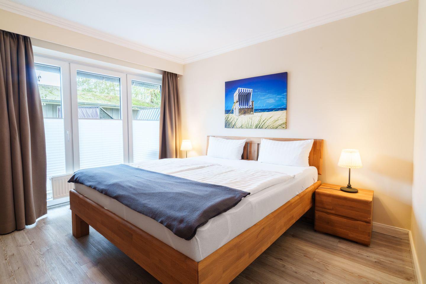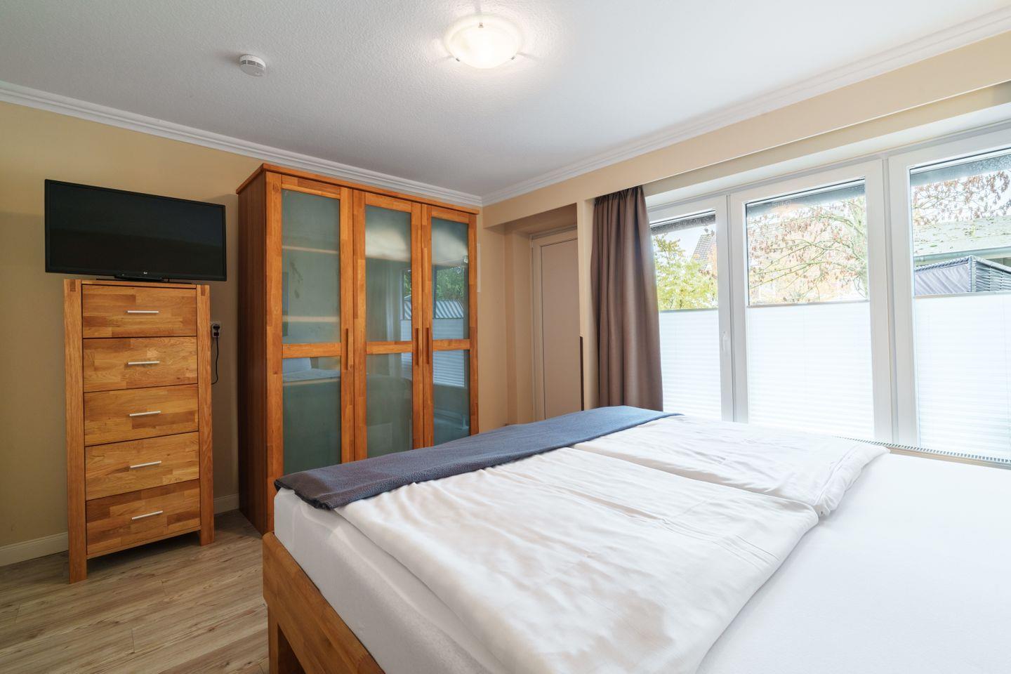 Doppelbett mit getrennten Matratzen (Komfort-Einstiegshöhe 65cm), dreitüriger Kleiderschrank, Kommode, TV, Nachtschränke, Zugang zur Ost-Terrasse, Plissee und Verdunkelungsvorhang