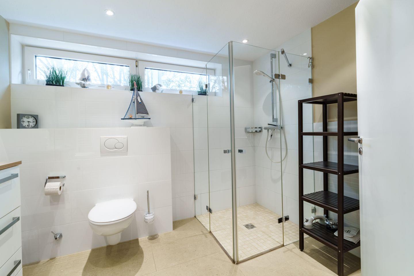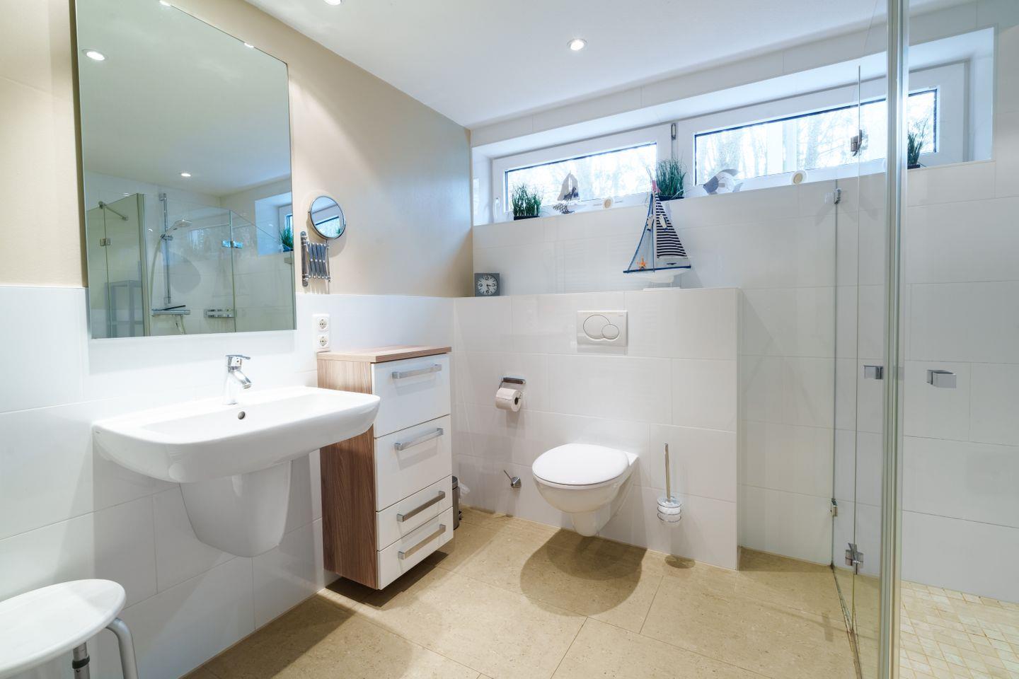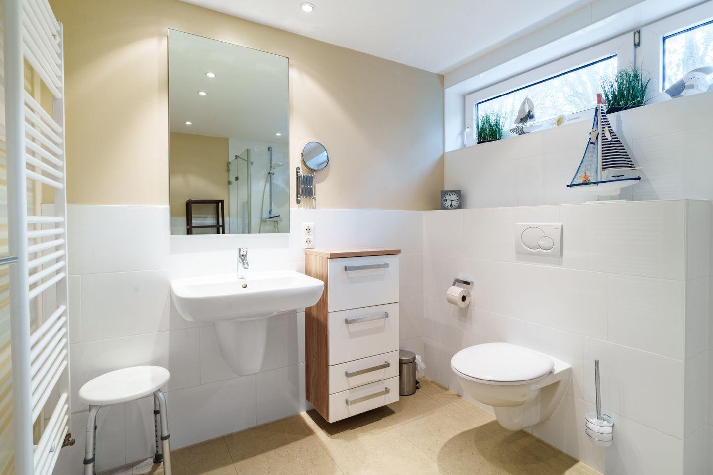 Ebenerdige Dusche, WC, Schminkspiegel, Duschhocker, Föhn, Fenster, Handtuchtrockner