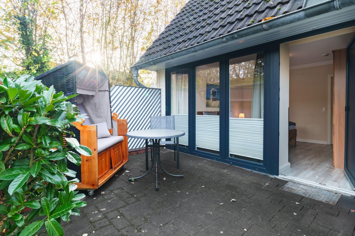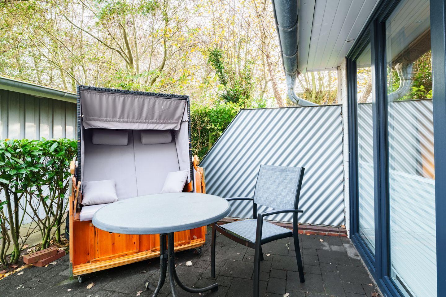 2 Terrassen, Strandkorb auf Ostterrasse, Gartenmöbel, W-LAN (HotSpot), überdachter Fahrradabstellplatz, sep. Eingang, 1 kostenloser Parkplatz, behindertenfreundlich, Garderobe, Wäsche optional dazu buchbar, gemeinschaftliche Waschmaschine + Trockner, Strandkorb am Strand in der Saison inklusive