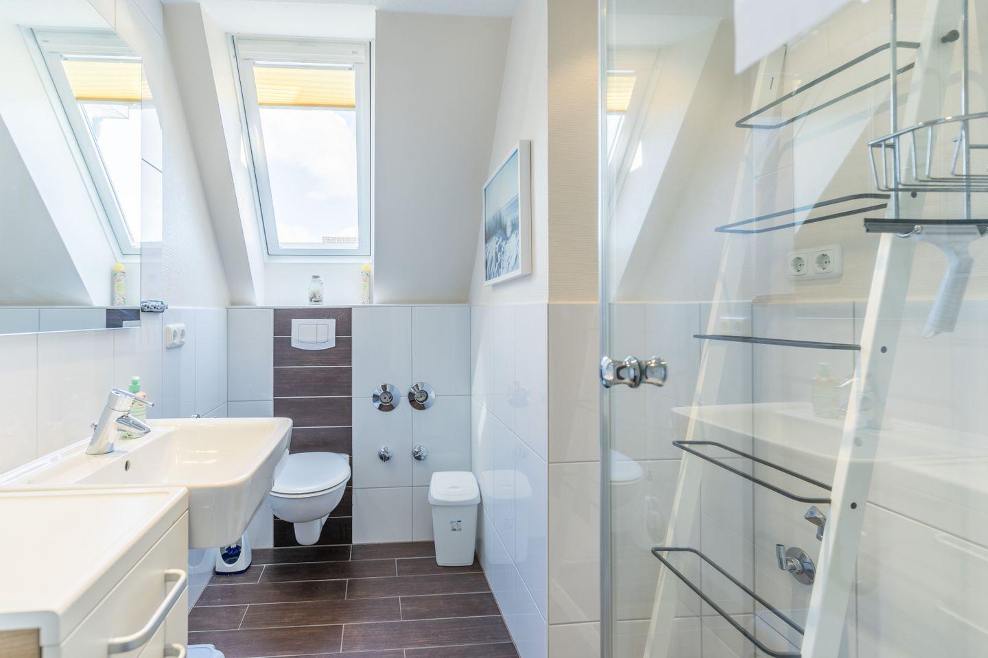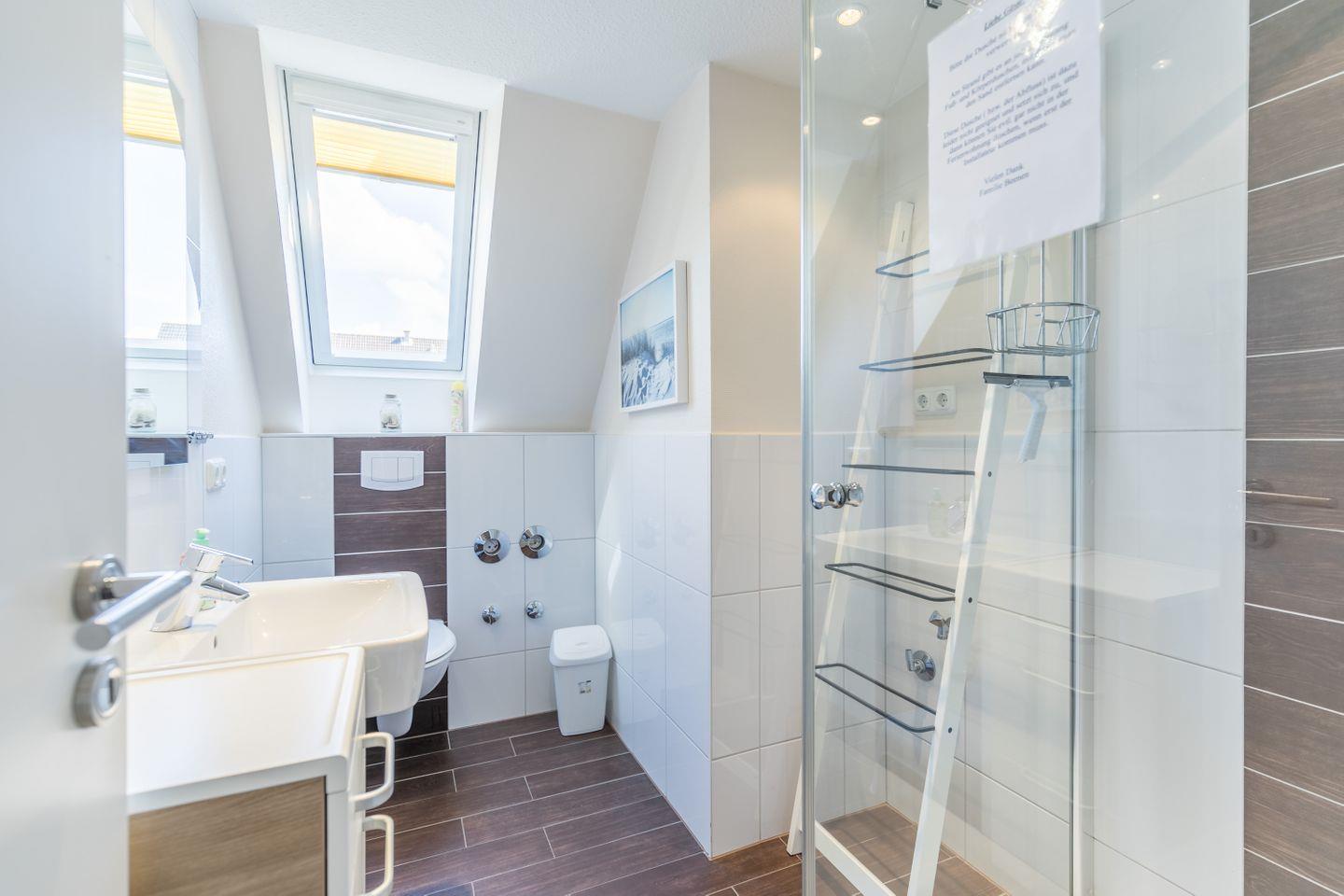 Duschkabine, WC, Fön und Waschtisch mit Ablage, Handtuchheizung, Spiegel