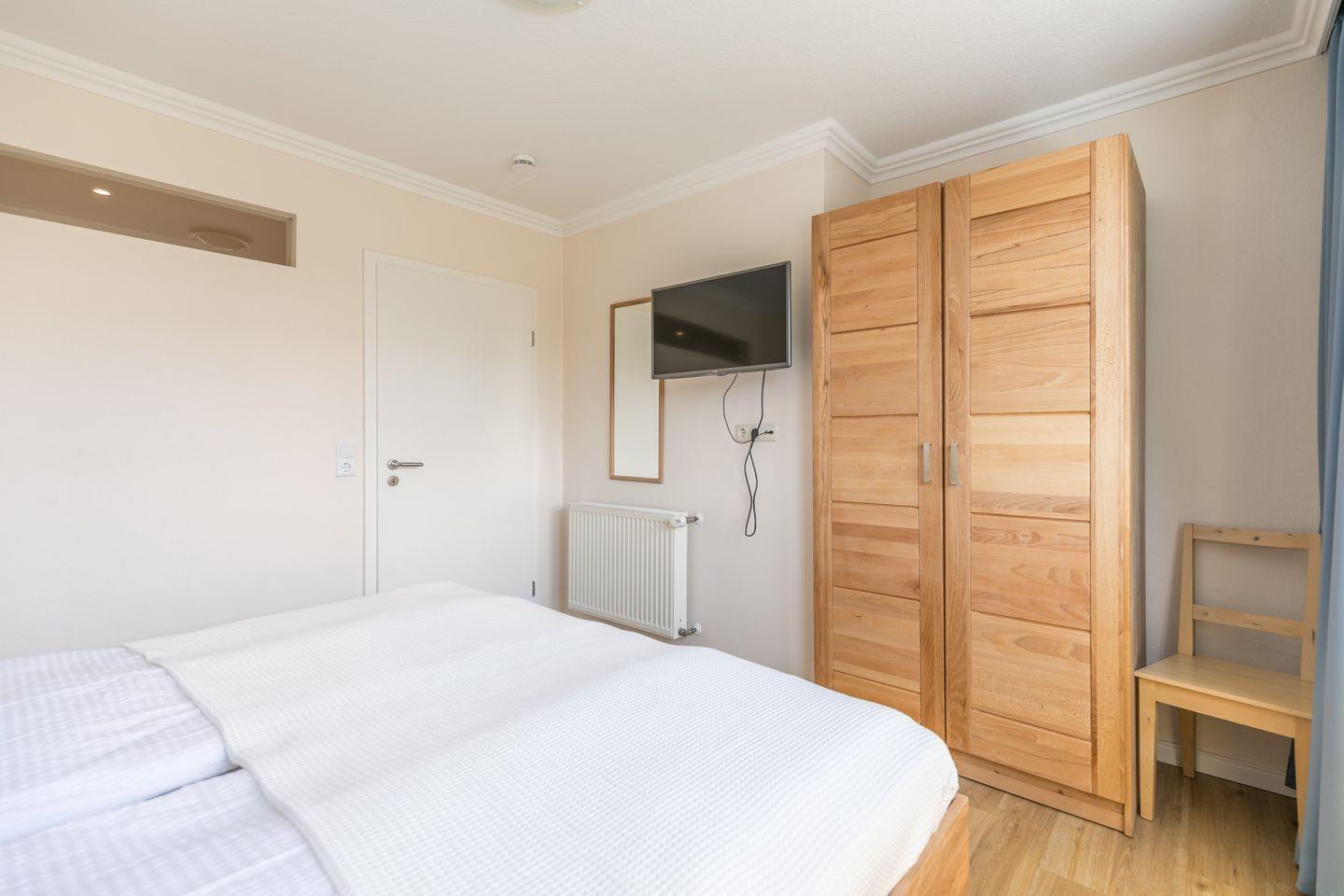 Doppelbett mit getrennten Matratzen (je 200x 90cm) mit zwei Nachtkonsolen, Kleiderschrank 2-türig, Flachbild-TV