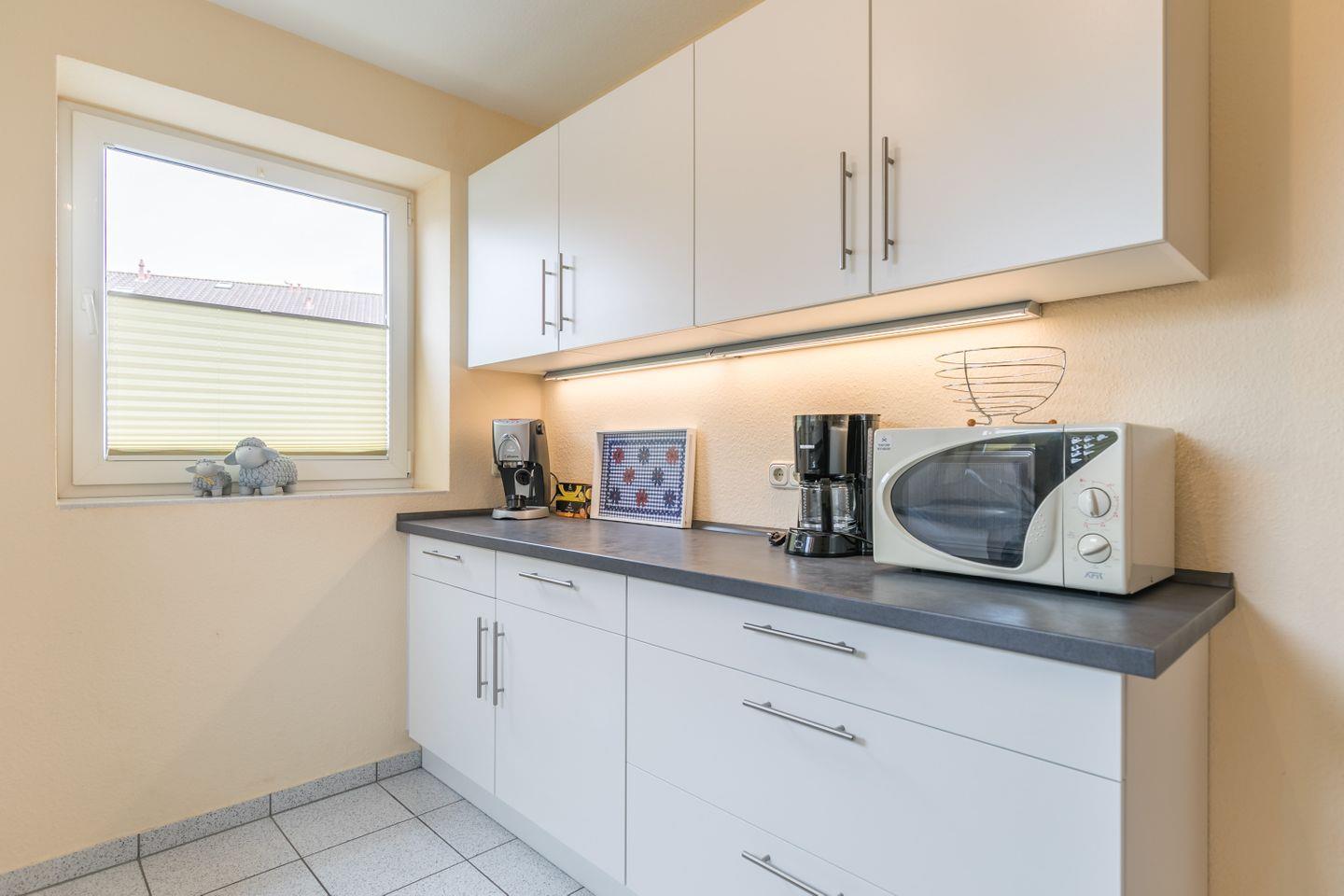Küche: Küche mit Backofen, Geschirrspüler, Wasserkocher, Kaffeemaschine + zusätzliche Tchibo Caffissimo, Essecke