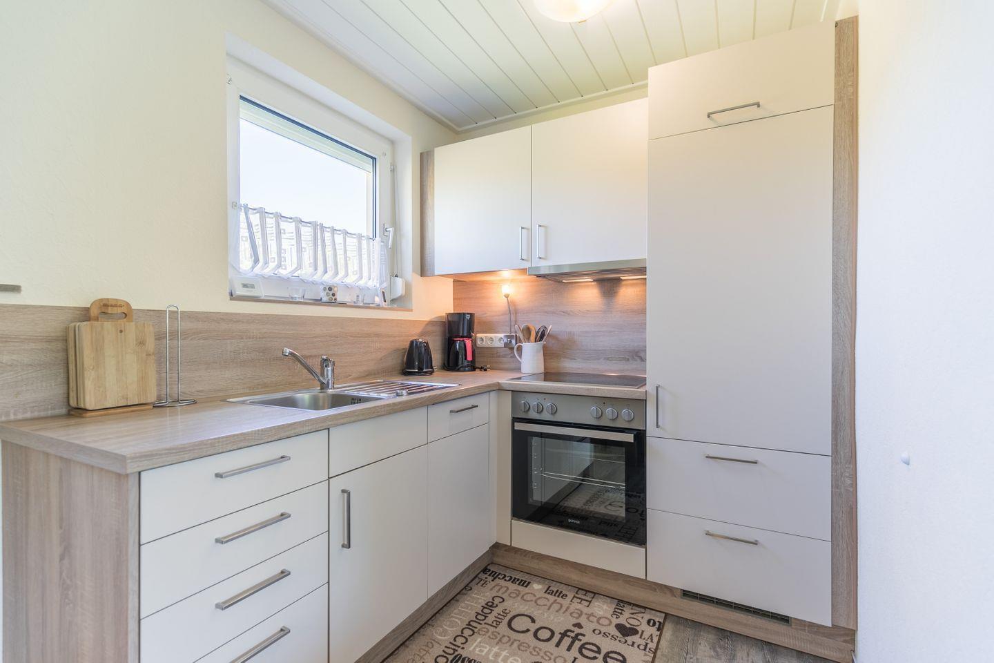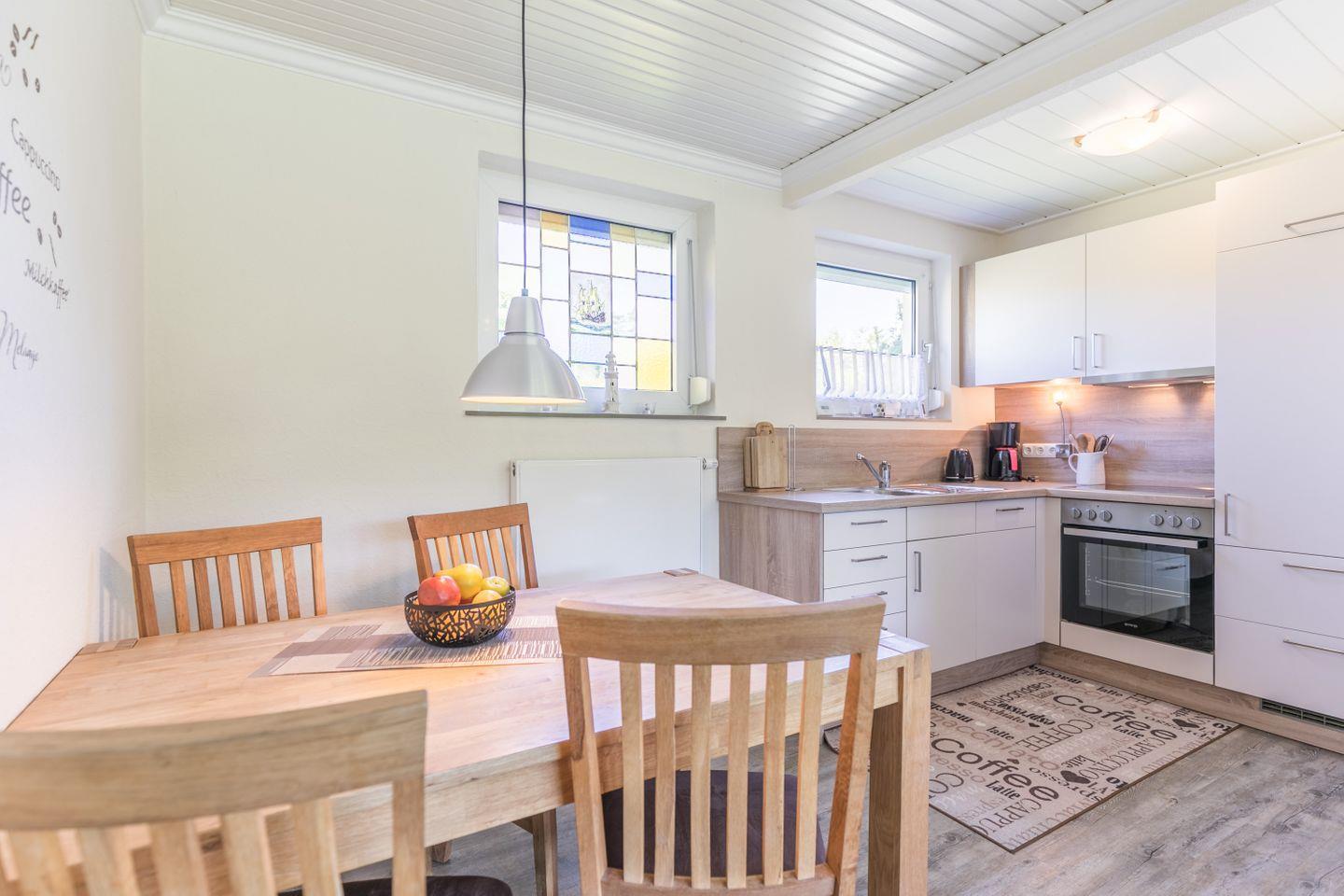 Tisch mit 4 Stühlen, Geschirrspüler, Herd mit Ceranfeld und Backofen, Kühlschrank mit Gefrierfach, Toaster, Wasserkocher, Eierkocher, Kaffeemaschine, Fenster, Fliegengitter