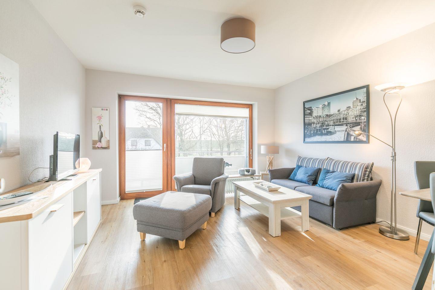 Die Wohnung verfügt über ein helles, offenes Wohnzimmer mit einer Couch, die sich bei Bedarf in ein bequemes Bett mit Schlaffunktion verwandeln lässt. Angrenzend befindet sich die gut ausgestattete Küchenzeile, die das Kochen in der Ferienwohnung zum Vergnügen macht. Vom Wohnzimmer aus gelangt man auf den Balkon, der mit Balkonmöbeln ausgestattet ist und zu erholsamen Stunden im Freien einlädt