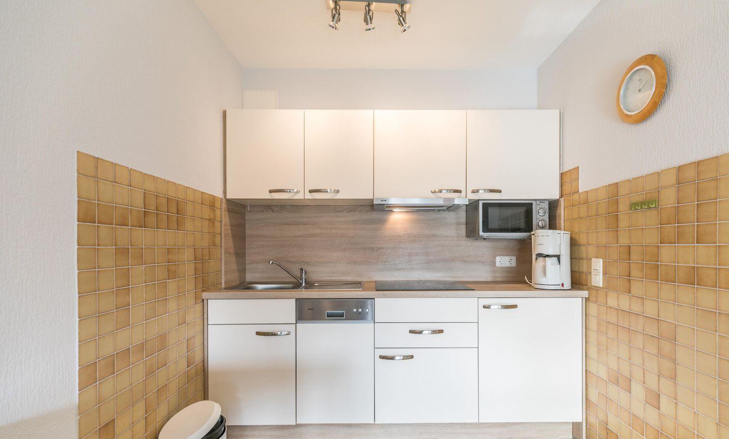 Ceranfeld, Mikrowelle, Kühlschrank mit Gefrierfach, Geschirrspüler, Dunstabzug, Kaffeemaschine, Wasserkocher, Toaster, Eierkocher