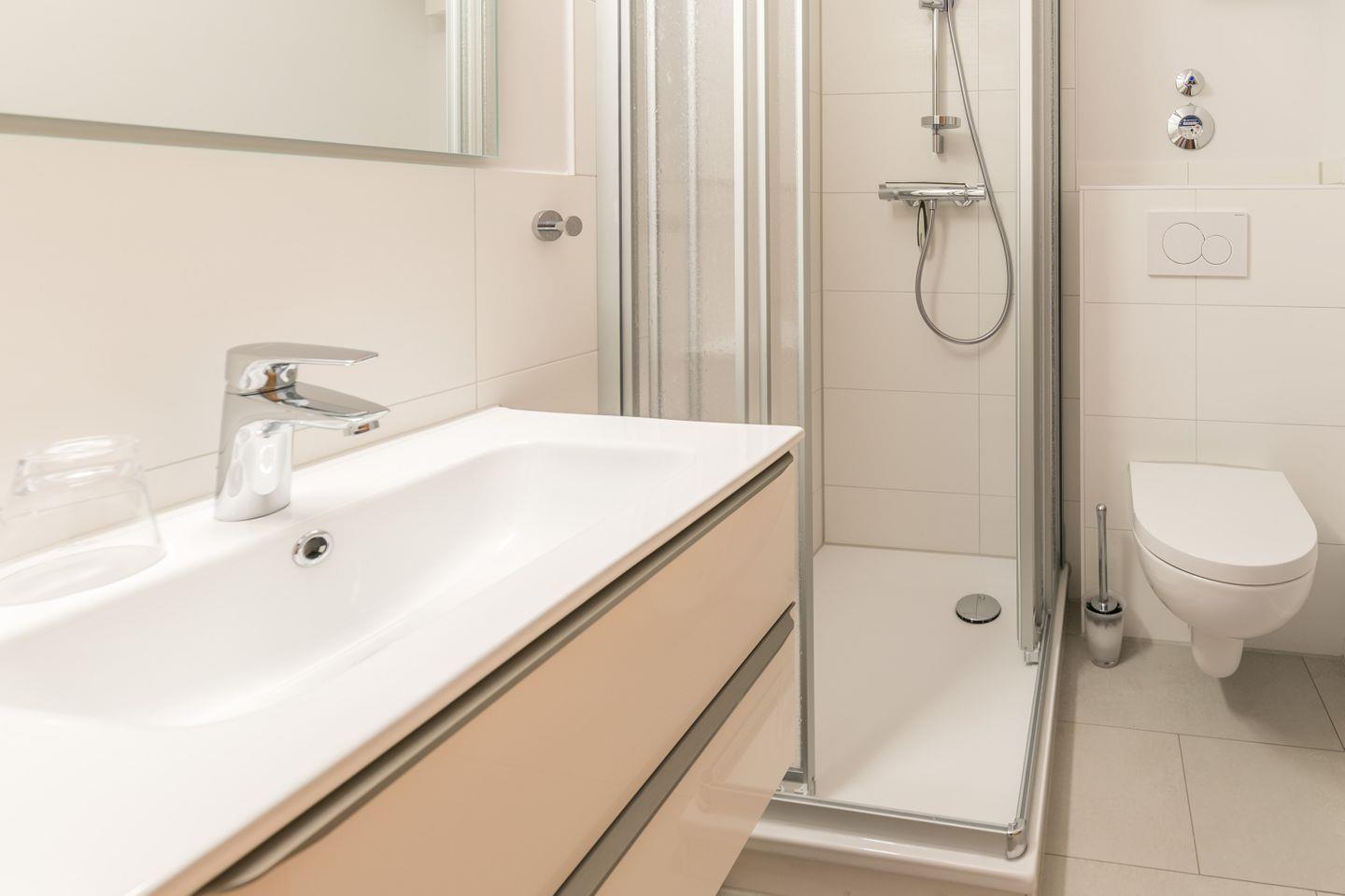 Dusche, WC, Waschbecken, Spiegel, Föhn, Handtuchtrockner