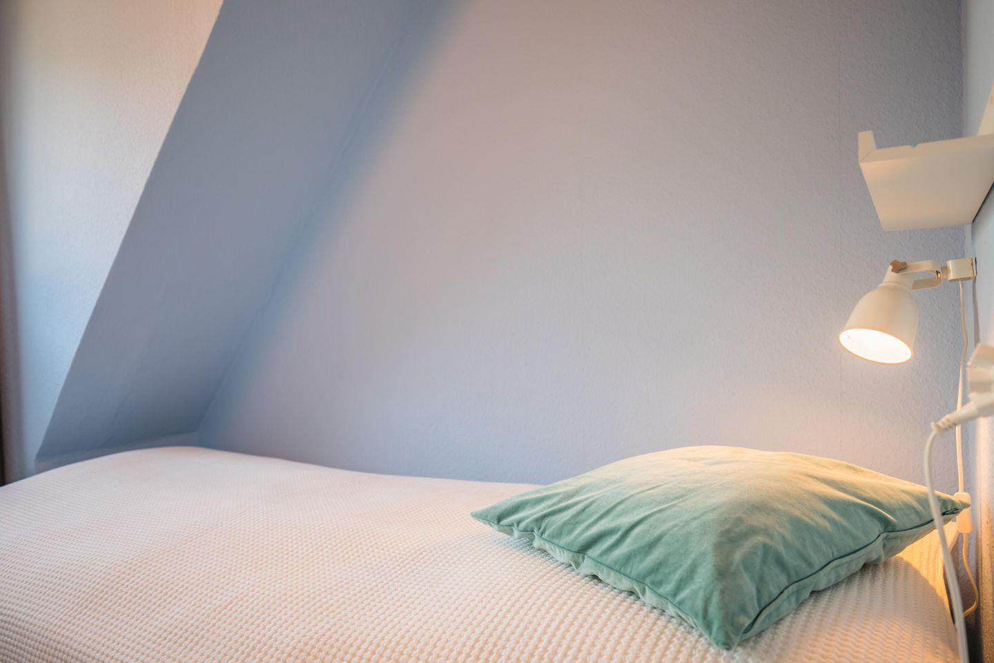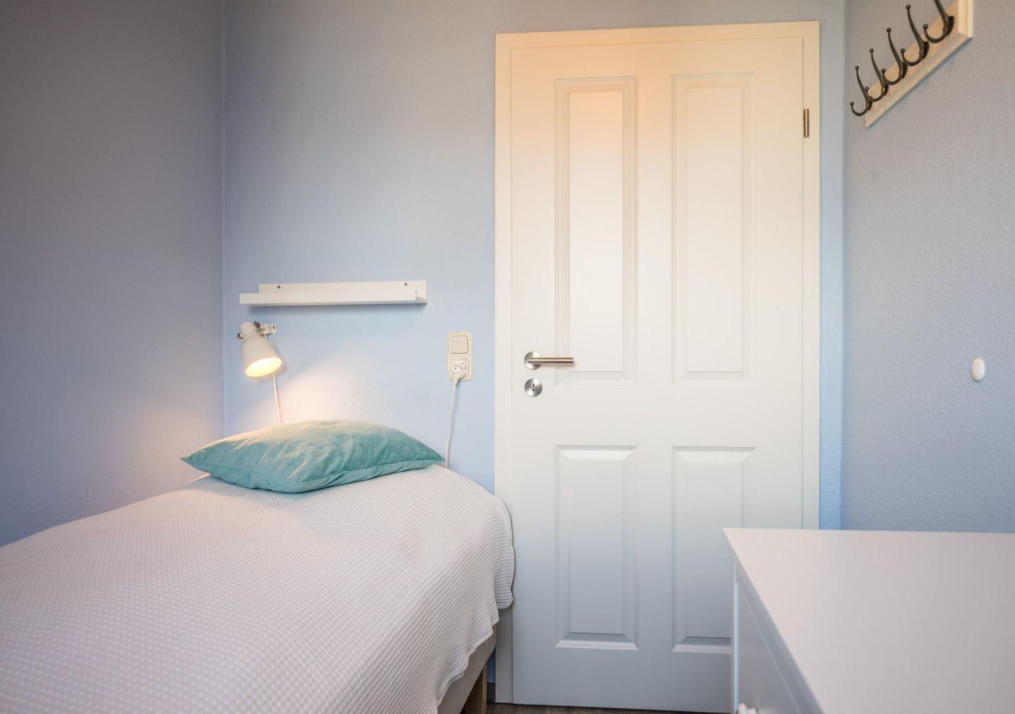 Einzelbett (2,00 x 0,90m), Nachttisch + Lampe, Garderobenhaken, Verdunkelungsvorhang