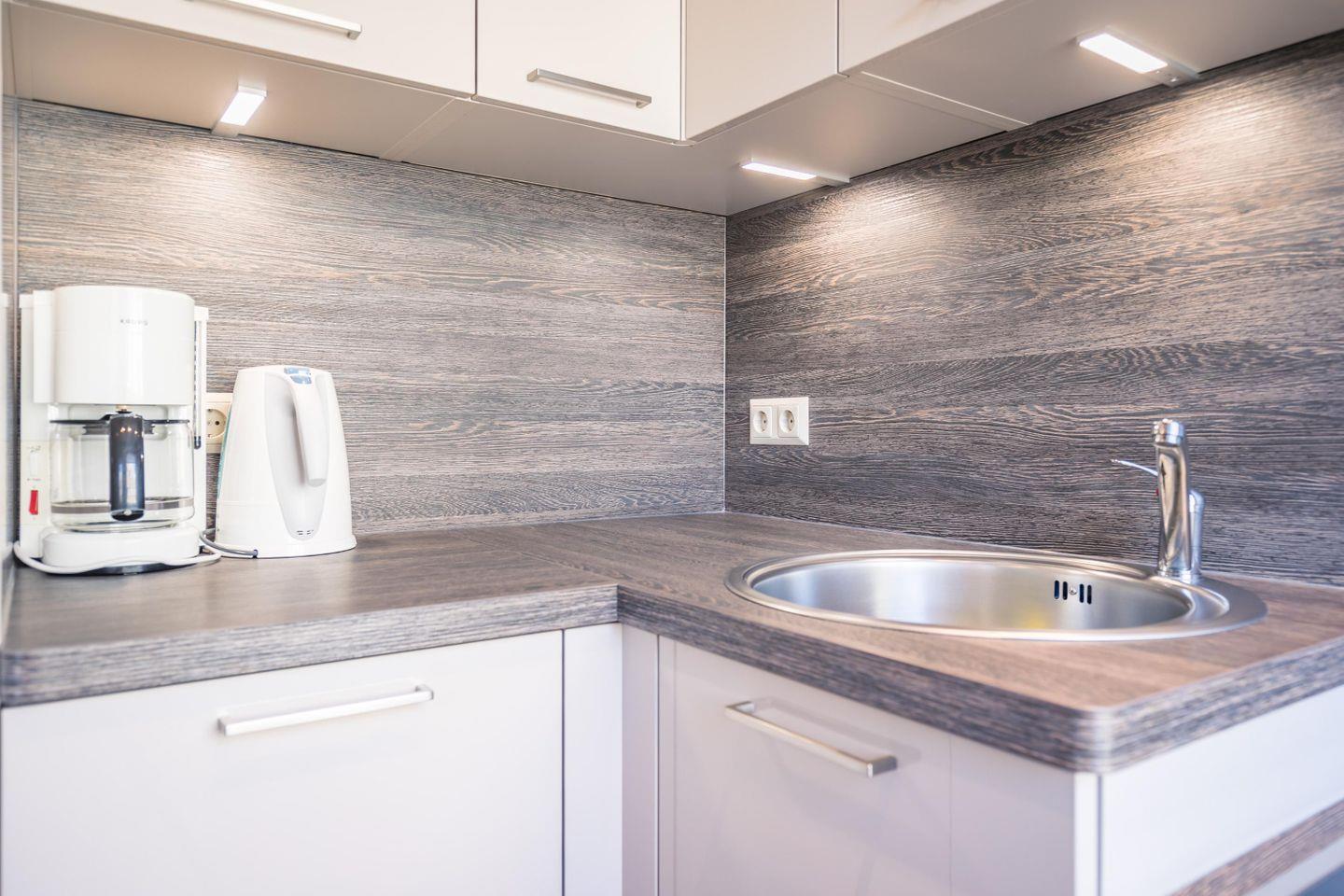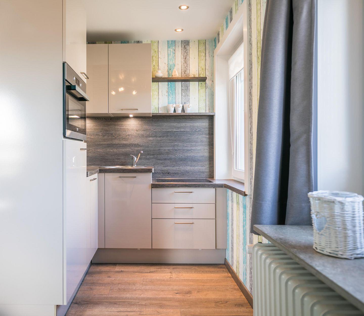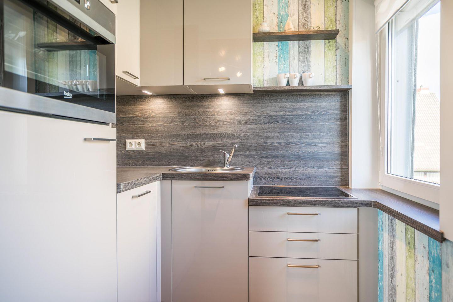 Cerankochfeld, Geschirrspüler, Backofen, Kühlschrank mit Gefrierfach, Kaffeemaschine, Wasserkocher, Fenster, Toaster, Eierkocher