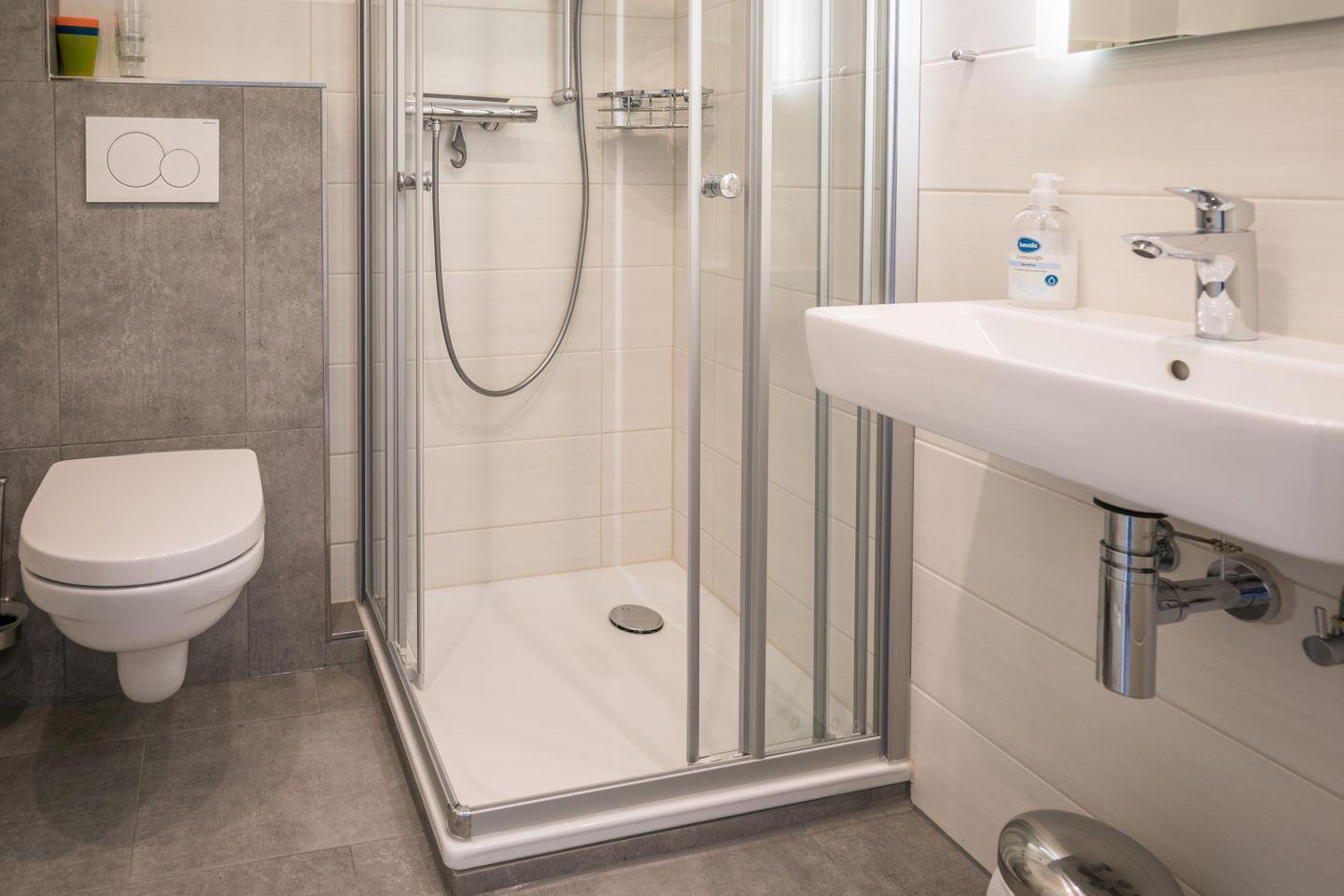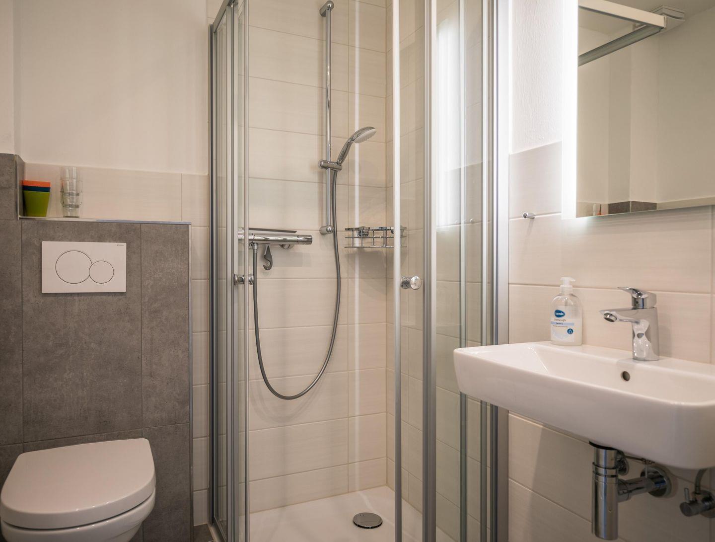 Dusche, WC, Waschbecken, Spiegelschrank, Abluft, Föhn, Handtuchtrockner