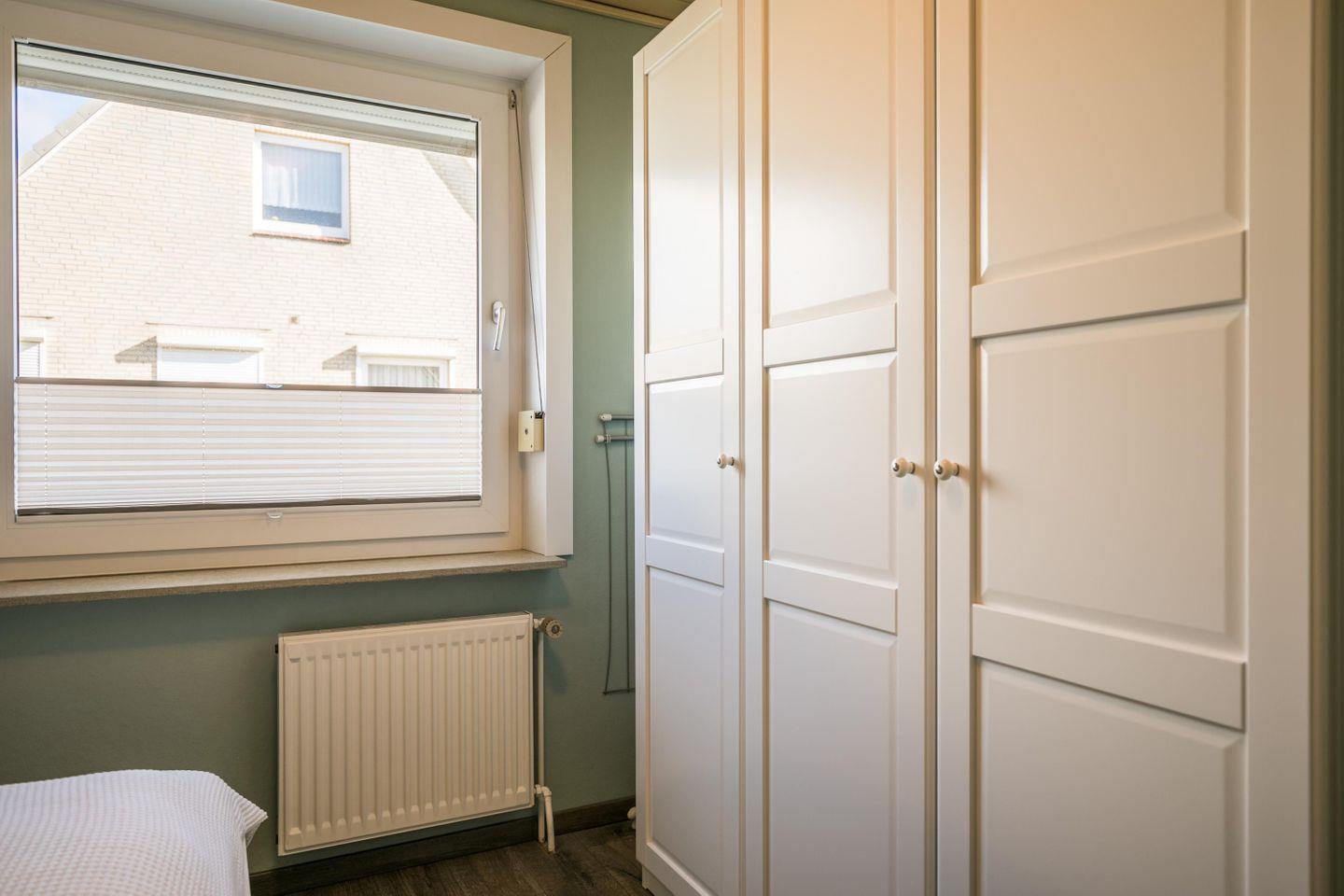1 Doppelbett mit getrennten Matratzen (je 2,00m x 0,90m), verstellbarer Lattenrost )Kopf- und Fußteil), Nachttisch + Lampe, 3-türiger Kleiderschrank, Außenrolläden + Plissee
