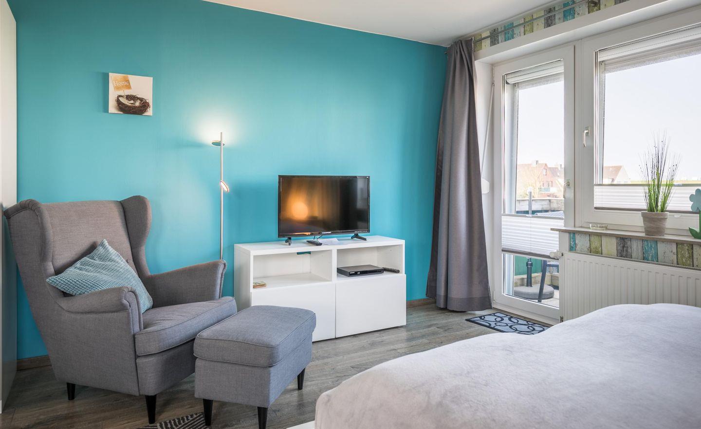 Flachbild-TV, DVD &Blu-ray-Player, 2 Ohrensessel mit Fußhockern, Esstische + Stühle, Doppelbett mit getrennten Matratzen (je 2,00 x 0,90m), Nachttisch + Lampen, 2 türiger Kleiderschrank, Zugang zum Balkon, Verdunklungsvorhang/Jalousie + Plissee