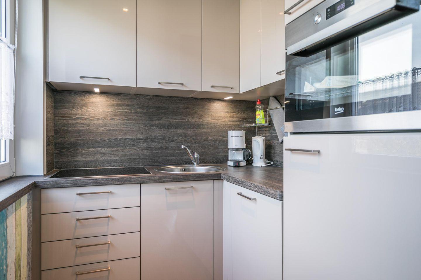 Ceranfeld, Backofen, Kühlschrank mit Gefrierfach, Geschirrspüler, Wasserkocher, Kaffeemaschine, Toaster, Eierkocher