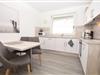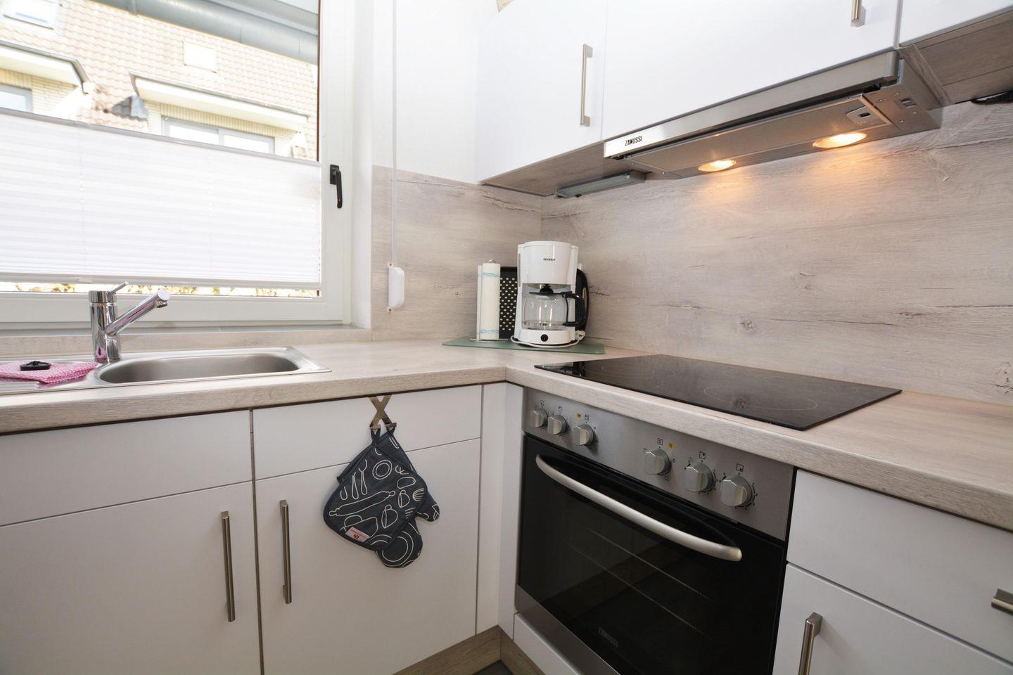Ceranfeld, Backofen, Geschirrspüler, Mikrowelle, Kühlschrank mit Gefrierfach, Wasserkocher, Kaffeemaschine, Kaffeepadmaschine, Toaster, Abzug, Fenster, Tisch + 4 Stühle, Radio