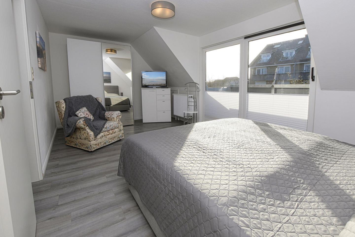 Boxspringdoppelbett mit durchgehender Matratze (1,80x2,00m),TV, Schränke, Nachttischlampen, Außenrollläden, Zugang zum Balkon