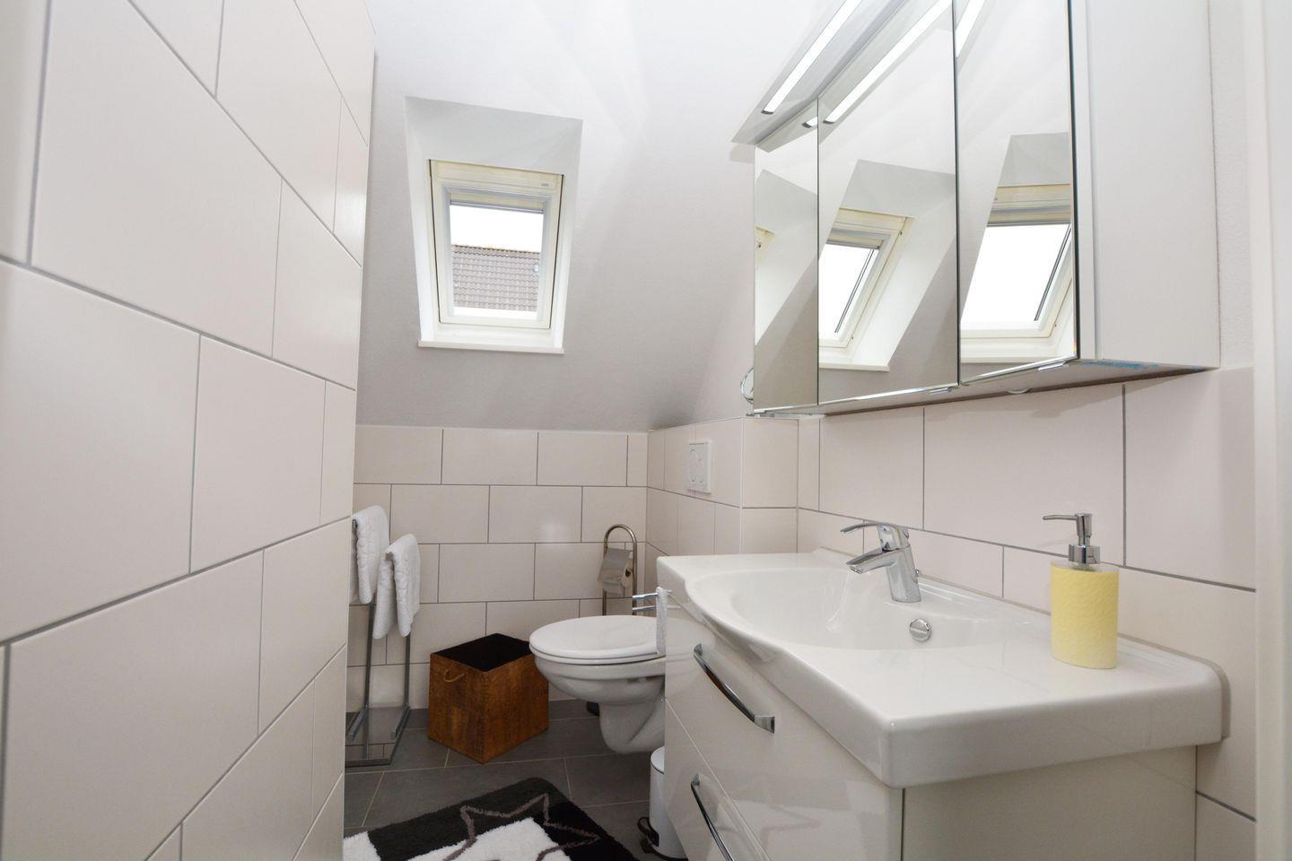 Dusche, WC, Spiegelschrank, Fenster, Kosmetikspiegel, Duschhocker, Föhn