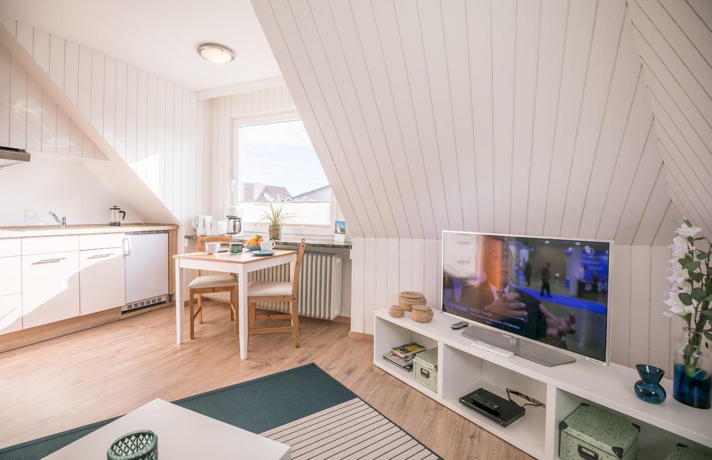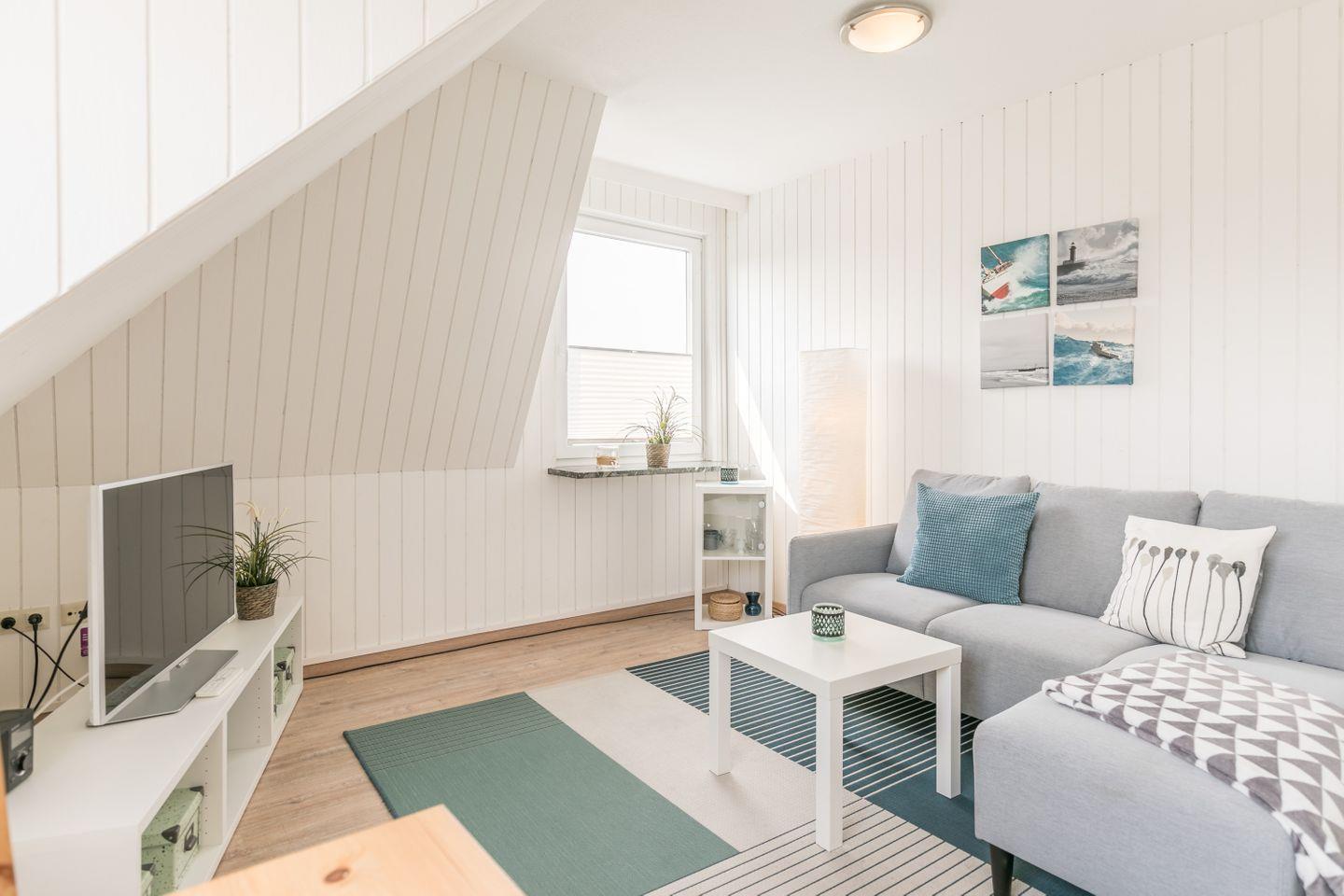Sie liegt im 2. Obergeschoss nahe dem Zentrum von Büsum. Helle Farben und ansprechende Möbel sorgen für ein behagliches Wohnklima. Auf dem großen Flachbildfernseher können Sie gemütlich fernsehen und auf den neuen Möbeln den Abend entspannt ausklingen lassen. Die neue Pantry-Küche ist zweckmäßig eingerichtet.