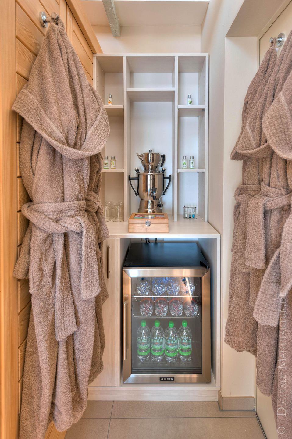 Sie haben die Wahl und können ganz nach Saunalust- und Laune entscheiden, ob Sie lieber den Saunaofen anwerfen oder die direkte Wärme der Infrarotstrahler genießen. Für Abwechslung sorgen verschiedene Aufgüsse. Eine anschließende Abkühlung verschafft Ihnen die Regenschauerdusche. Für jeden Gast liegt ein flauschiger Bademantel und ein Saunatuch bereit. Genießen Sie nach einem ausgiebigen Saunagang einen frisch gebrühten Tee aus dem Samowar, diverse Teesorten stehen zur Verfügung, oder ein kühles Getränk aus dem stylischen Glasgetränkekühlschrank.
