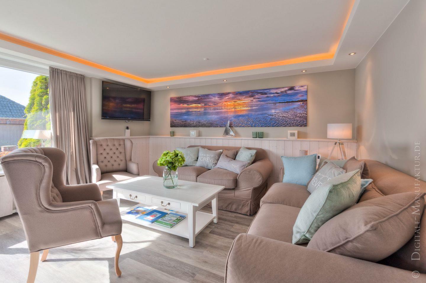Auf beiden Ebenen, in allen Räumen, drinnen oder draußen können Sie herrlich verweilen, das Wetter und salzhaltige Luft der Nordsee genießen, das Entertainment-Programm erleben oder in den ausgezeichneten, kuscheligen Boxspringdoppelbetten Ruhe finden. Diverse Rückzugsmöglichkeiten und eine zudem äußerst behagliche Wohnatmosphäre sind die besten Voraussetzungen Ihren Urlaub rundum perfekt werden zu lassen.