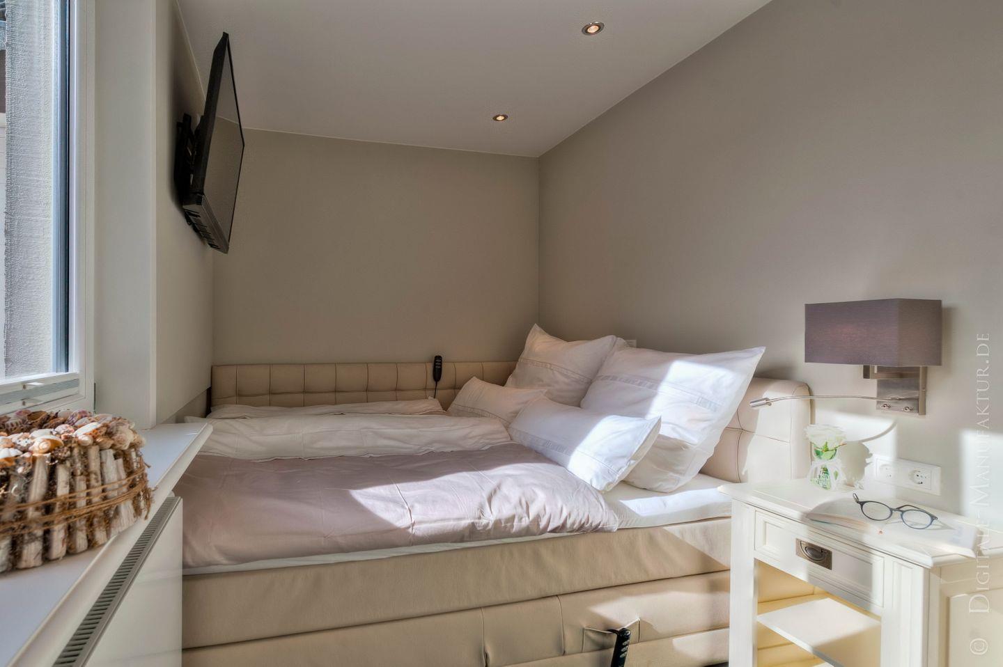 Schlafzimmer: elektrisch verstellbares Boxspringbett (1,80x2,00m), 42-Zoll Flachbildschirm-TV, allergikerfreundliche Bettdecken und Kissen, Nachttische mit Leselampen, Kleiderschrank