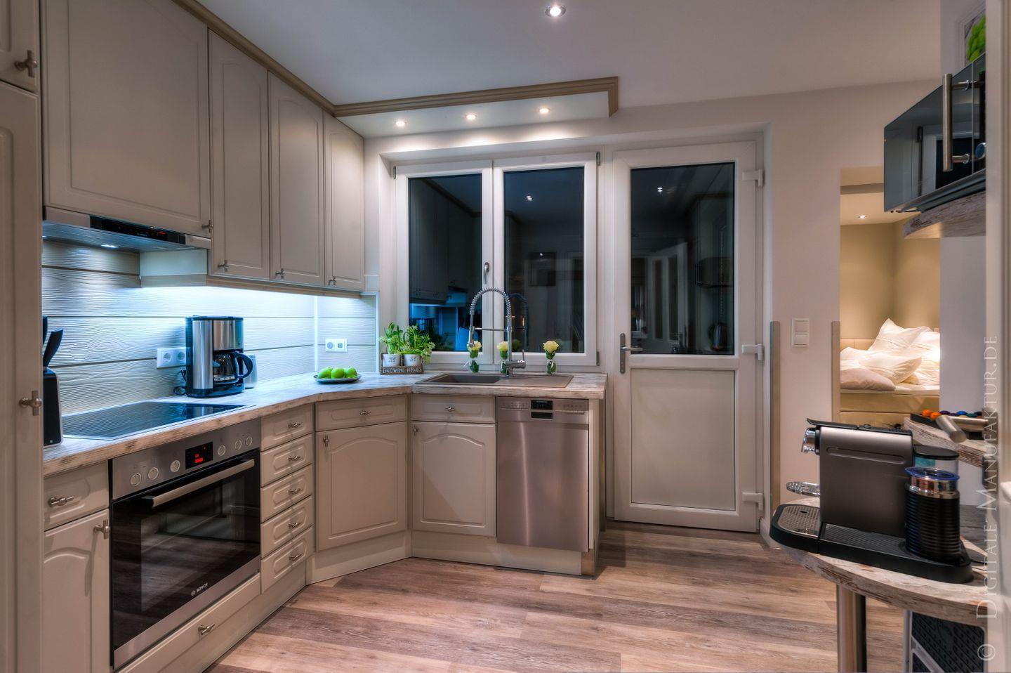 Küche: Ceran-Kochfeld, Backofen, Mikrowelle, Spülmaschine, Toaster, Wasserkocher, Kaffeemaschine, Nespressomaschine, Kühlschrank, Dunstabzug, Fenster, Zugang nach draußen