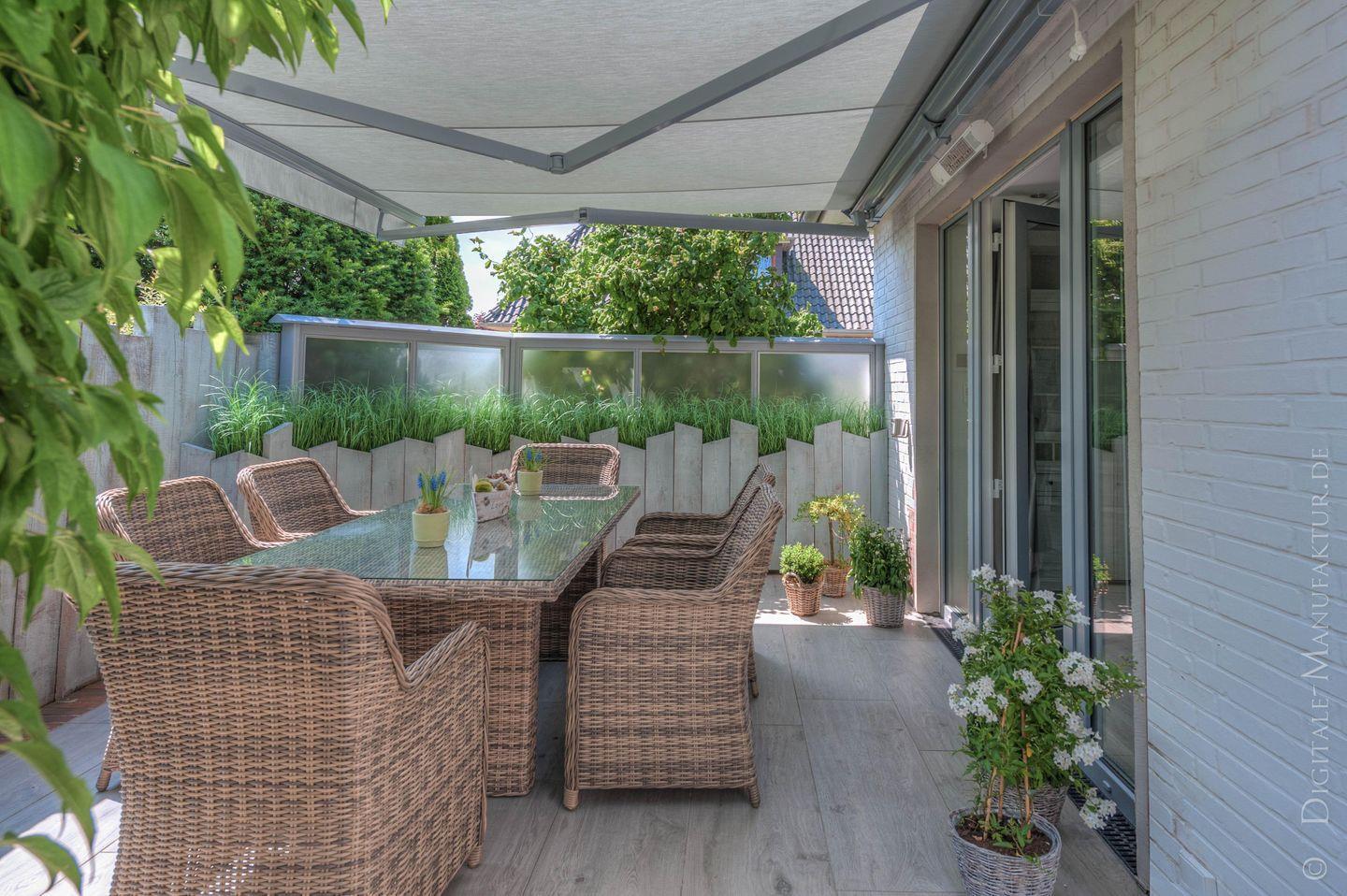 Zugang zur Terrasse mit einer geschützten Sitzecke, Strandkorb, Infrarotstrahler, ganzjährig nutzbarer Grill und Markise