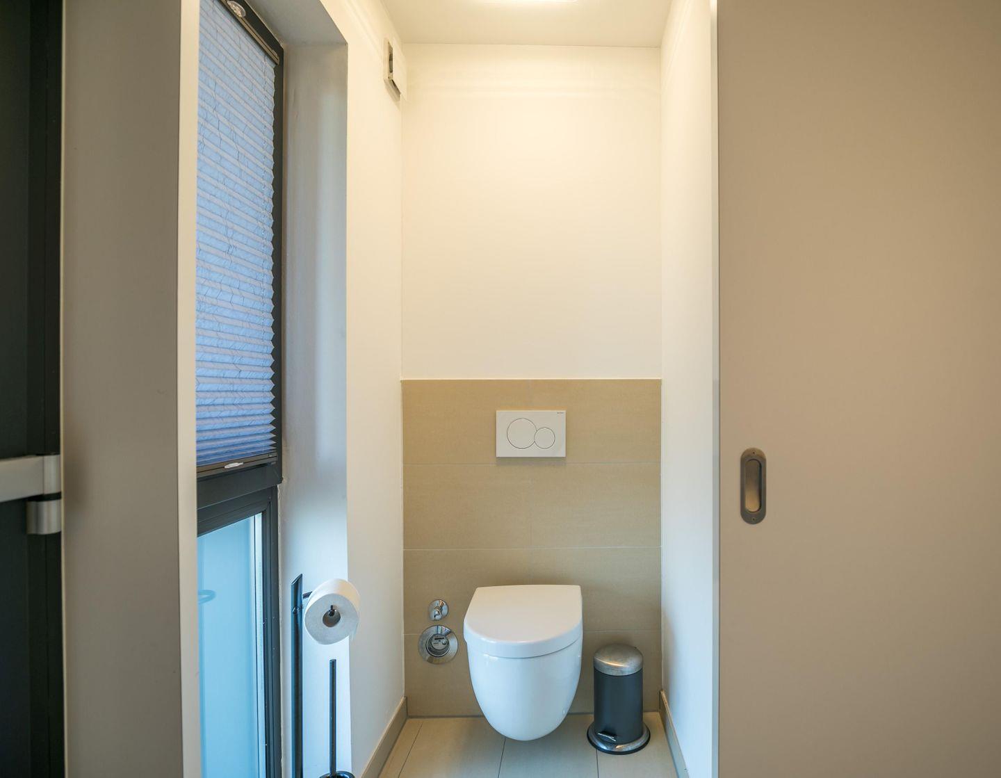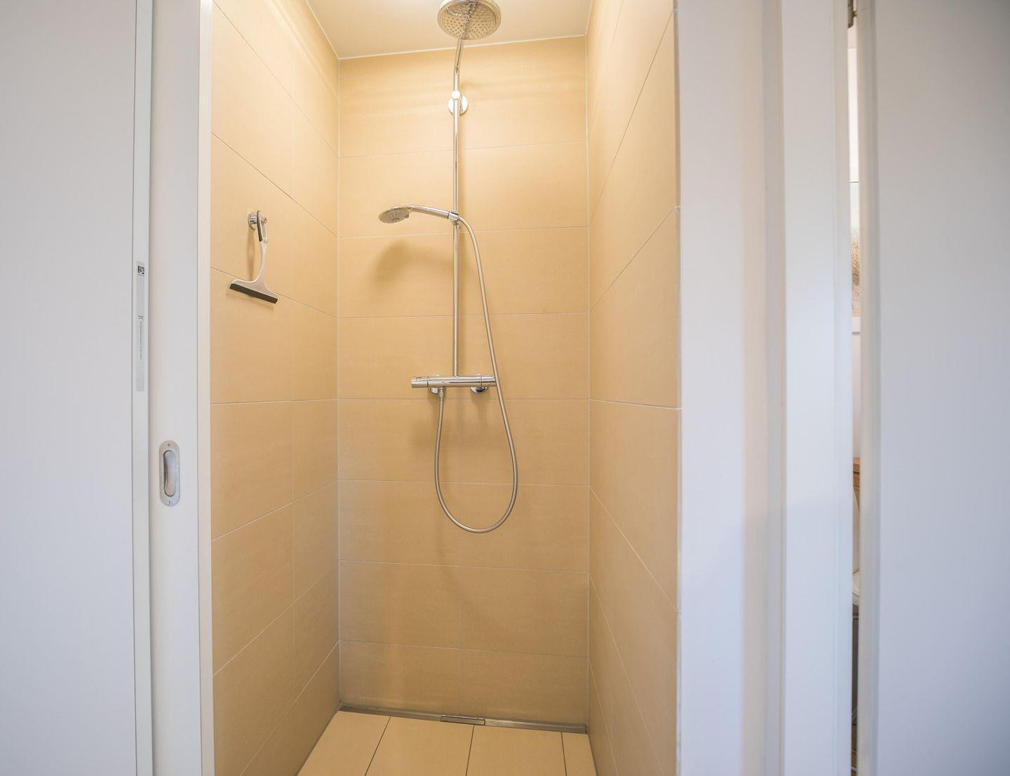 Im Eingangsbereich liegen die sanitären Einrichtungen. Die Dusche, das WC und der Waschtisch sind dabei jeweils mit einer Schiebetür zu verschließen.