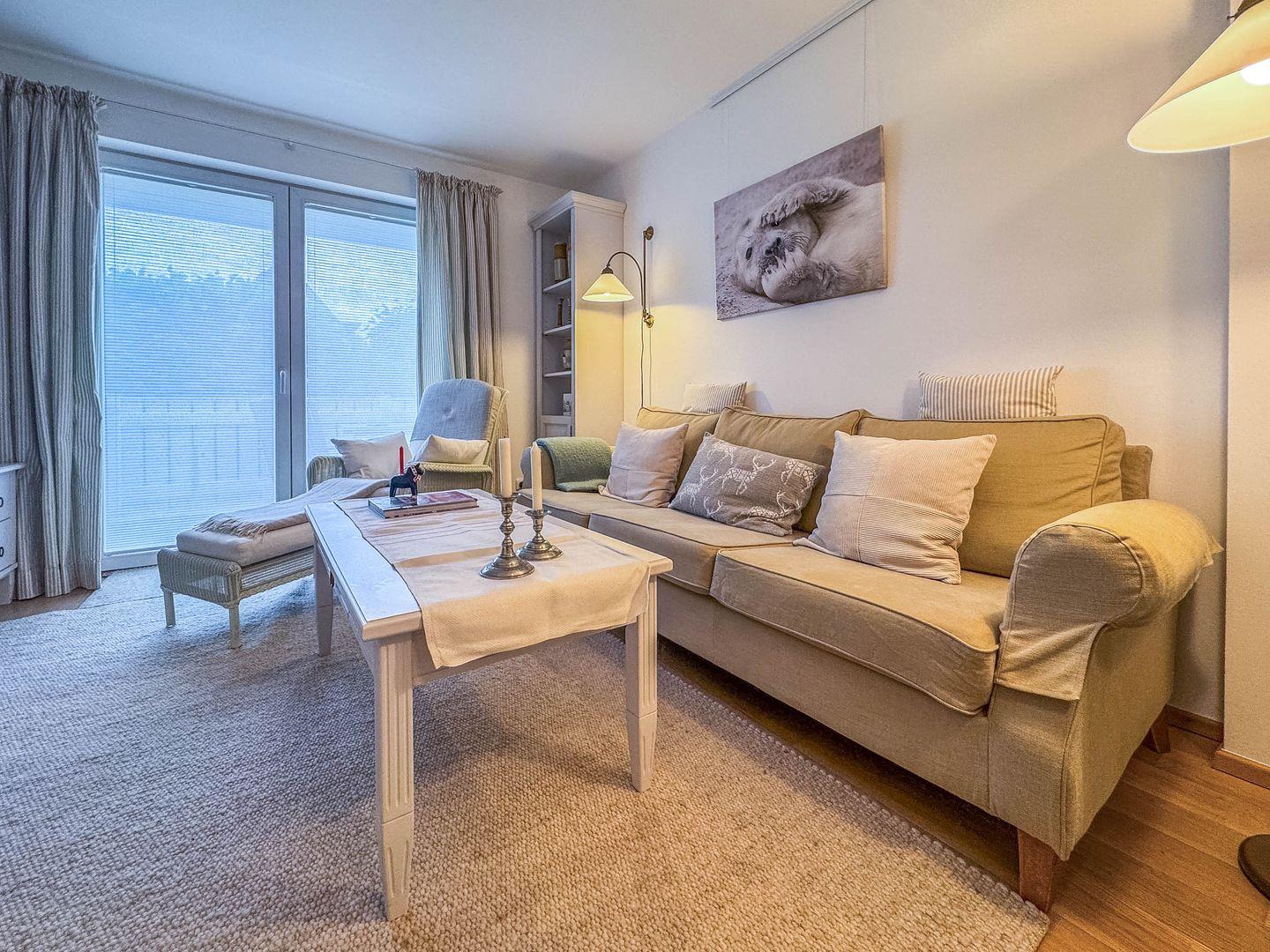 Polstergarnitur, zwei Korbsessel mit Fußhocker, Flachbildfernseher, Hi-Fi-Anlage, DVD-Player, Zugang zum Balkon/zur Terrasse
