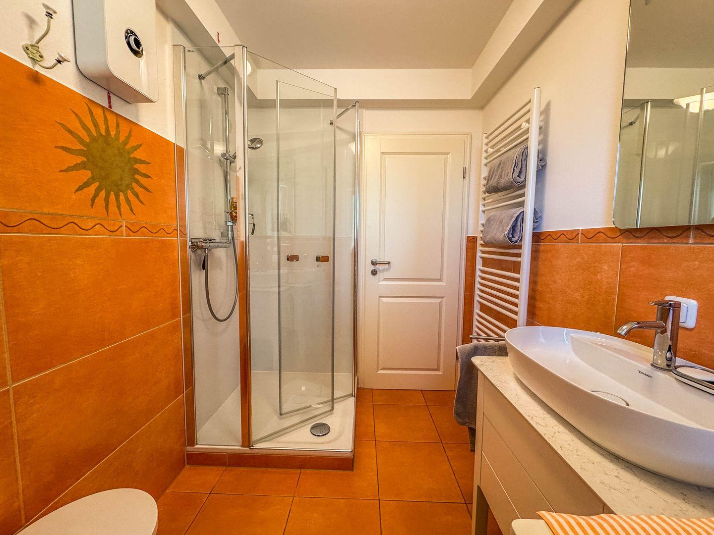Duschbad, WC, Föhn, Fußbodenheizung, beheizbarer Spiegel, Kosmetikspiegel, Handtuchwärmer, Waschtrockner, Tageslichtfenster