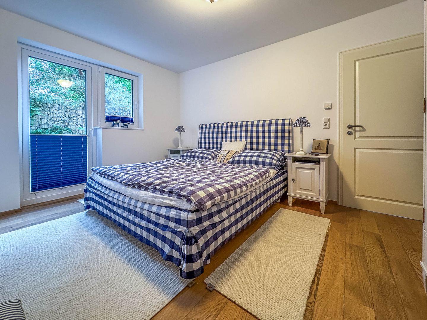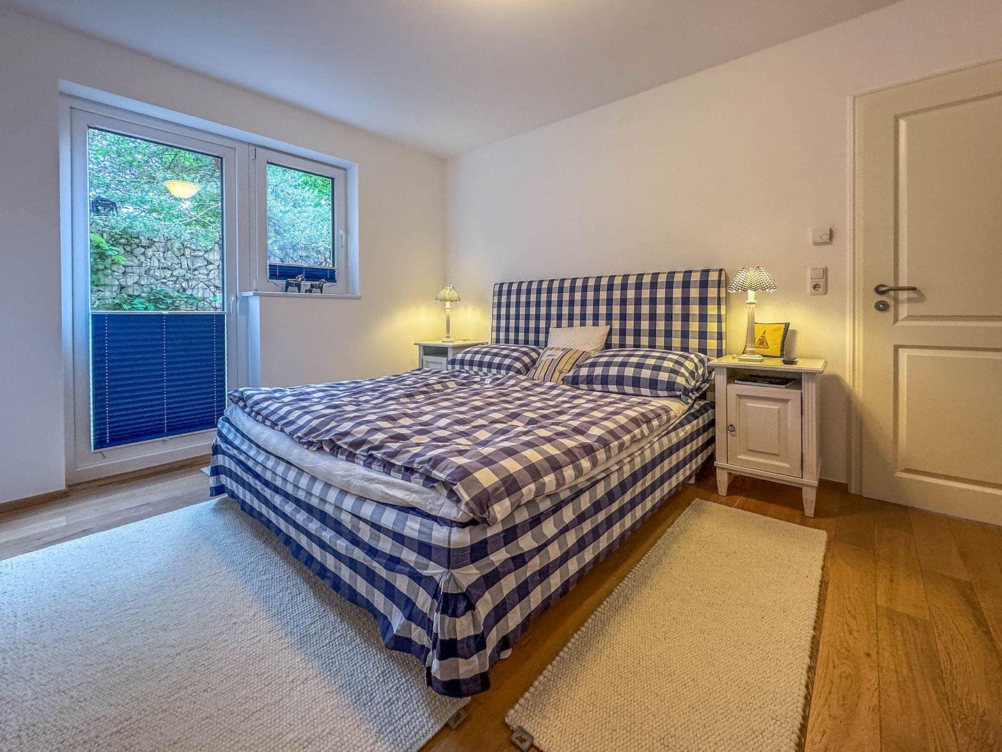 Der Hafen, der Hauptstrand, das Zentrum und der Bahnhof sind nur wenige Gehminuten entfernt. Die 2-Zimmer-Wohnung für zwei Personen setzt auf helle Sandtöne und skandinavische Gemütlichkeit. Das Herzstück ist das Hästens-Boxspringbett aus Naturmaterialien. Im Schlafzimmer befindet sich außerdem ein wandhängender Fernseher. Der Wohnbereich ist klar und behaglich eingerichtet. Im Garten erwarten Sie Sitzplätze zwischen Brunnenanlage und Teichbiotop. Eine Terrasse lädt zum Frühstück in der Sonne ein. Die Küche ist vollständig ausgestattet und macht Selbstversorgung leicht. Im Duschbad starten Sie dank Fußbodenheizung und Handtuchwärmer angenehm in den Tag.