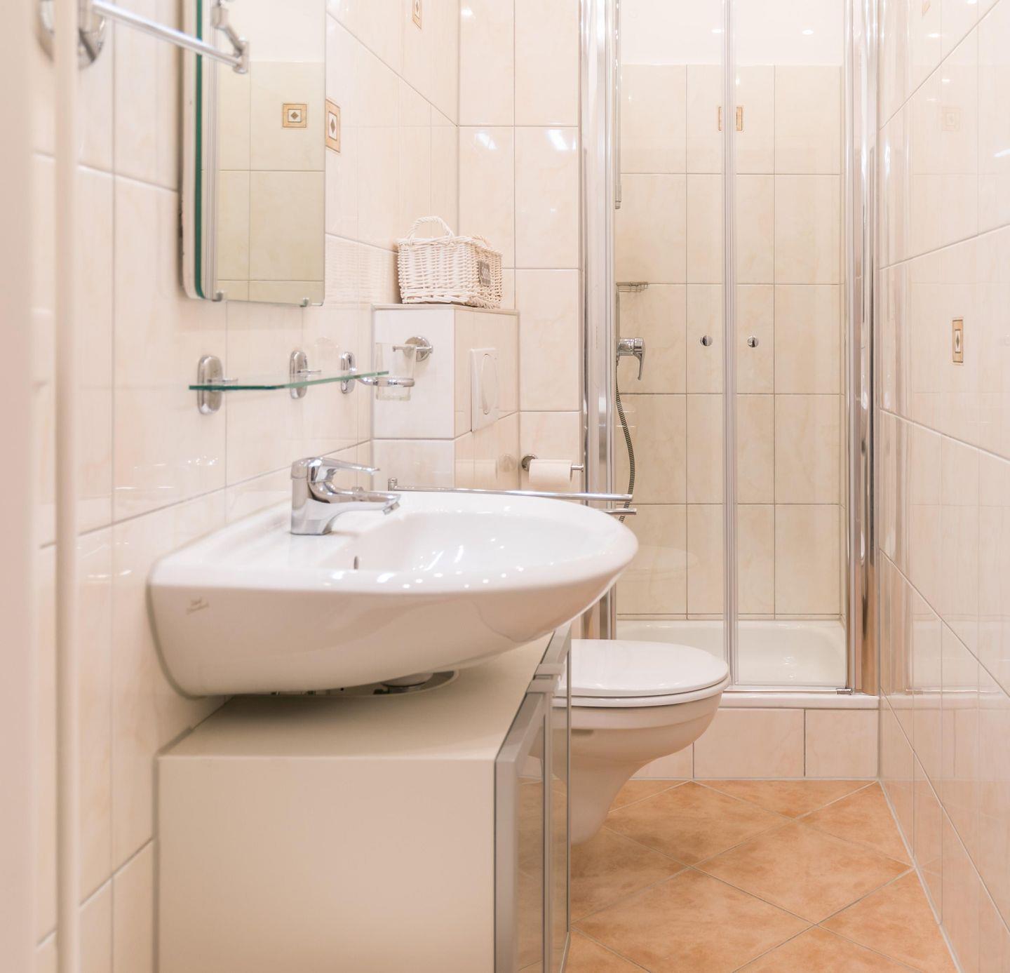Duschbad, WC, Spiegel, Waschbecken, Handtuchtrockner